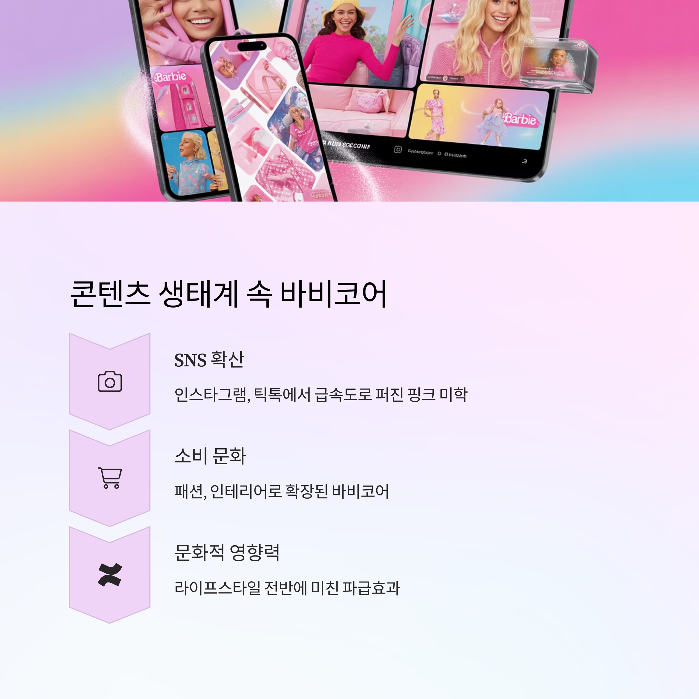 바비코어는 단순히 ‘예쁜 콘텐츠’로 소비되지 않습니다. 2025년의 디지털 콘텐츠 구조에서, 바비코어는 형식과 기능 모두를 지배하는 콘텐츠 전략으로 자리 잡았습니다. 즉, 바비코어는 콘텐츠의 **포맷, 전달방식, 소비방식**을 동시에 설계하는 키워드입니다.