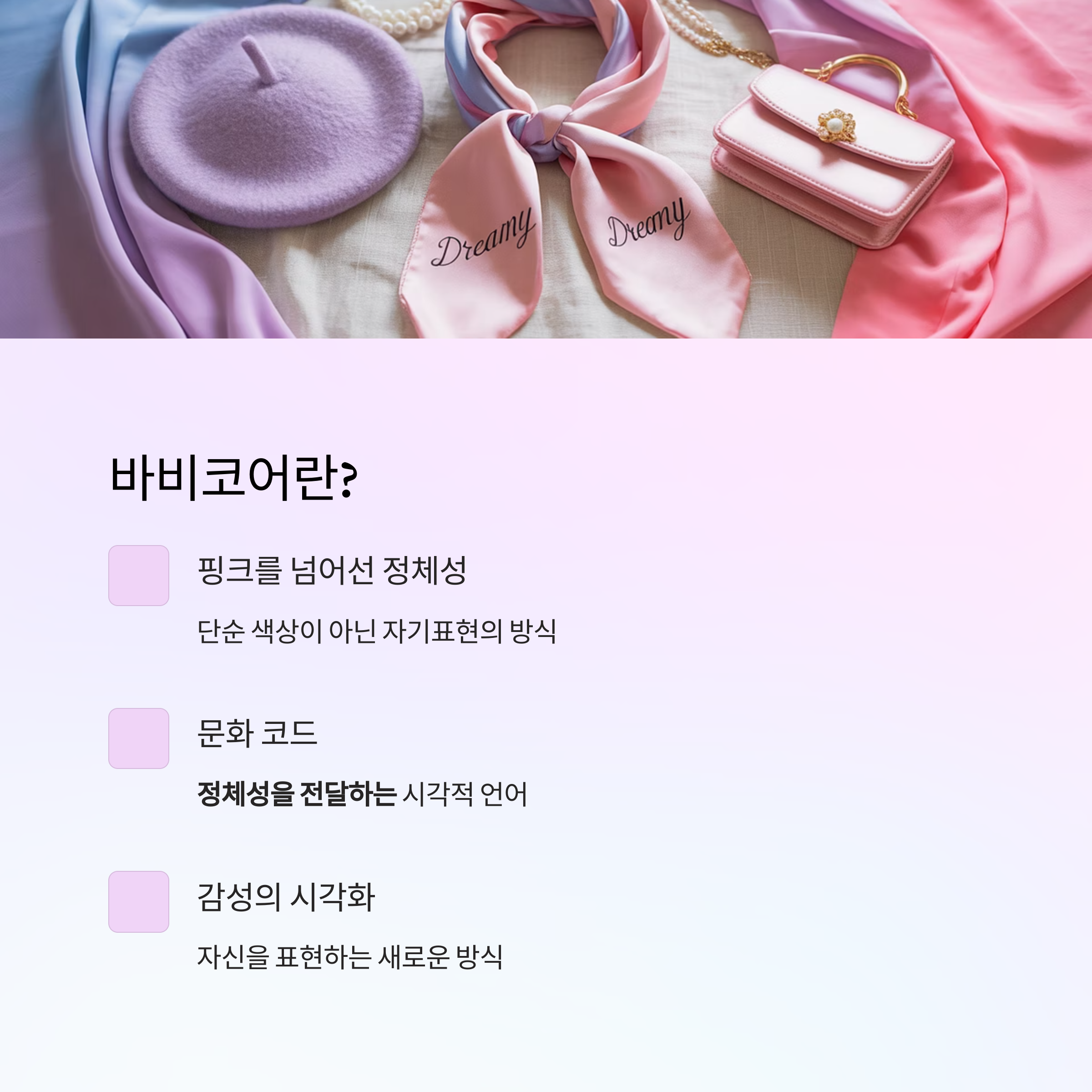 바비코어는 단순히 유행했던 스타일이 아닙니다. 그것은 감성을 시각화한 언어였고, 정체성을 전달한 문화 코드였습니다. 트렌드는 바뀌어도, 그 기반에 있는 ‘내가 누구인지 보여주고 싶은 욕망’은 바뀌지 않습니다.