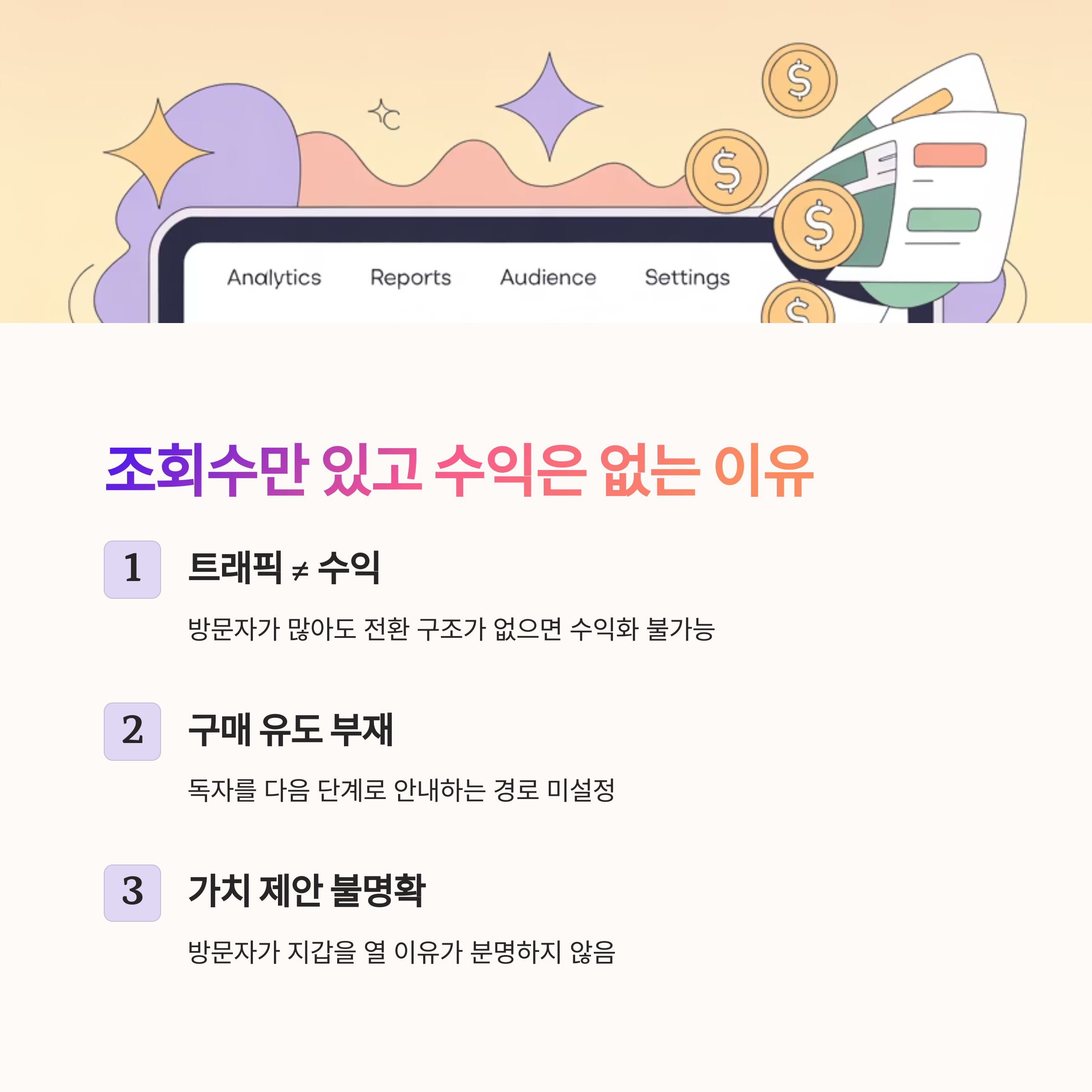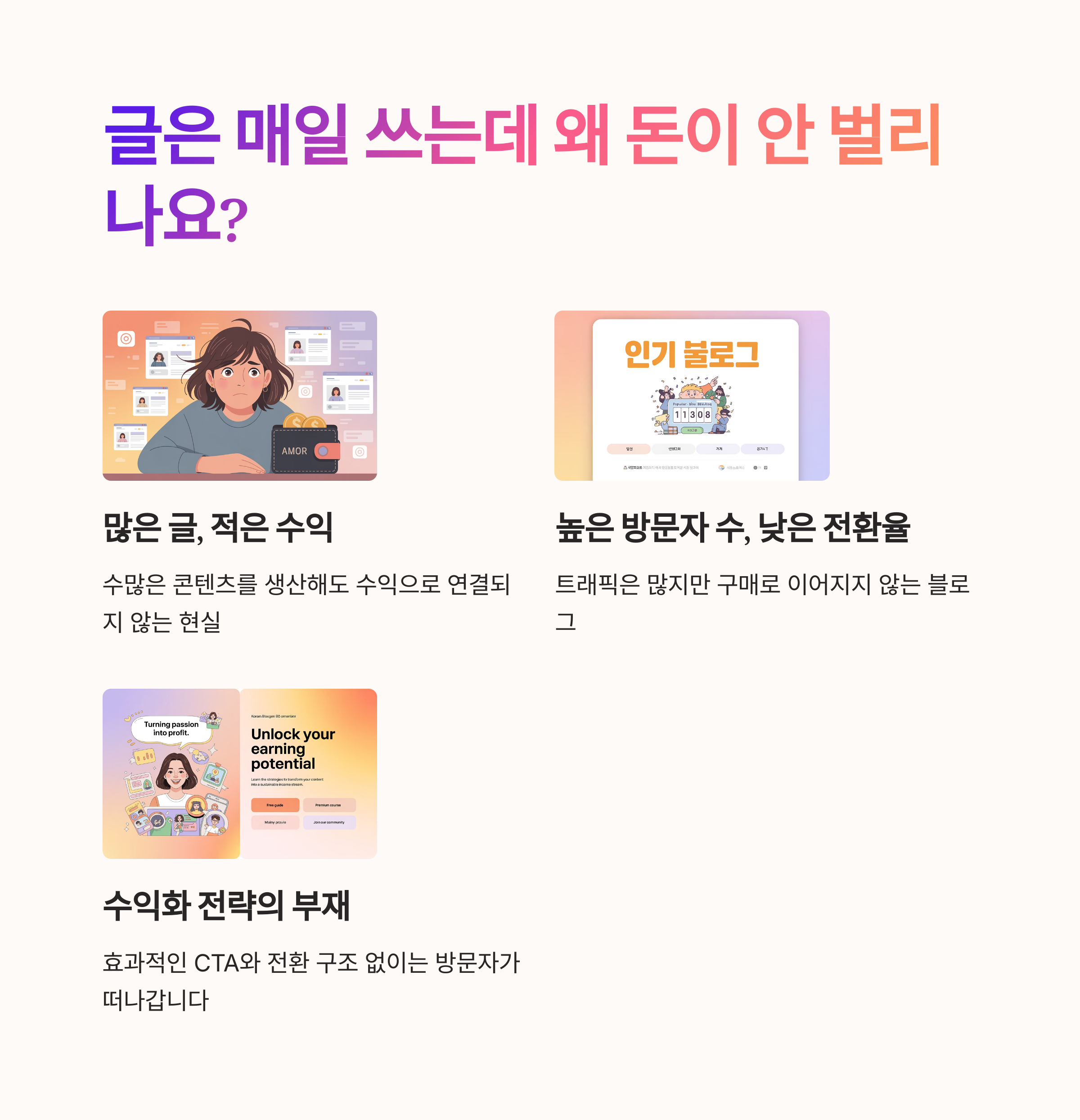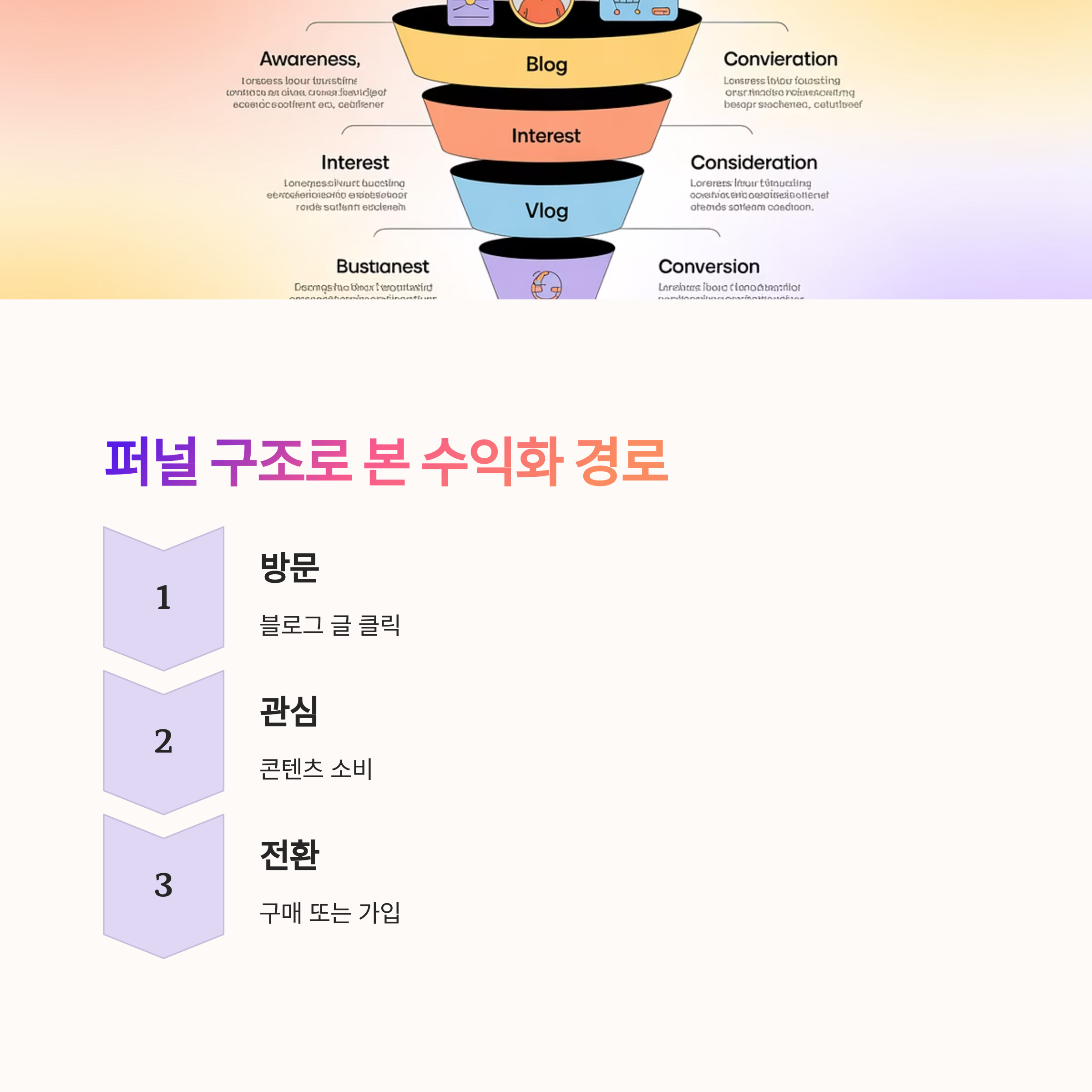 글만으로는 부족합니다. 콘텐츠에 수익 전환을 고려한 구조, 즉 CTA와 퍼널이 있어야 수익이 발생합니다.