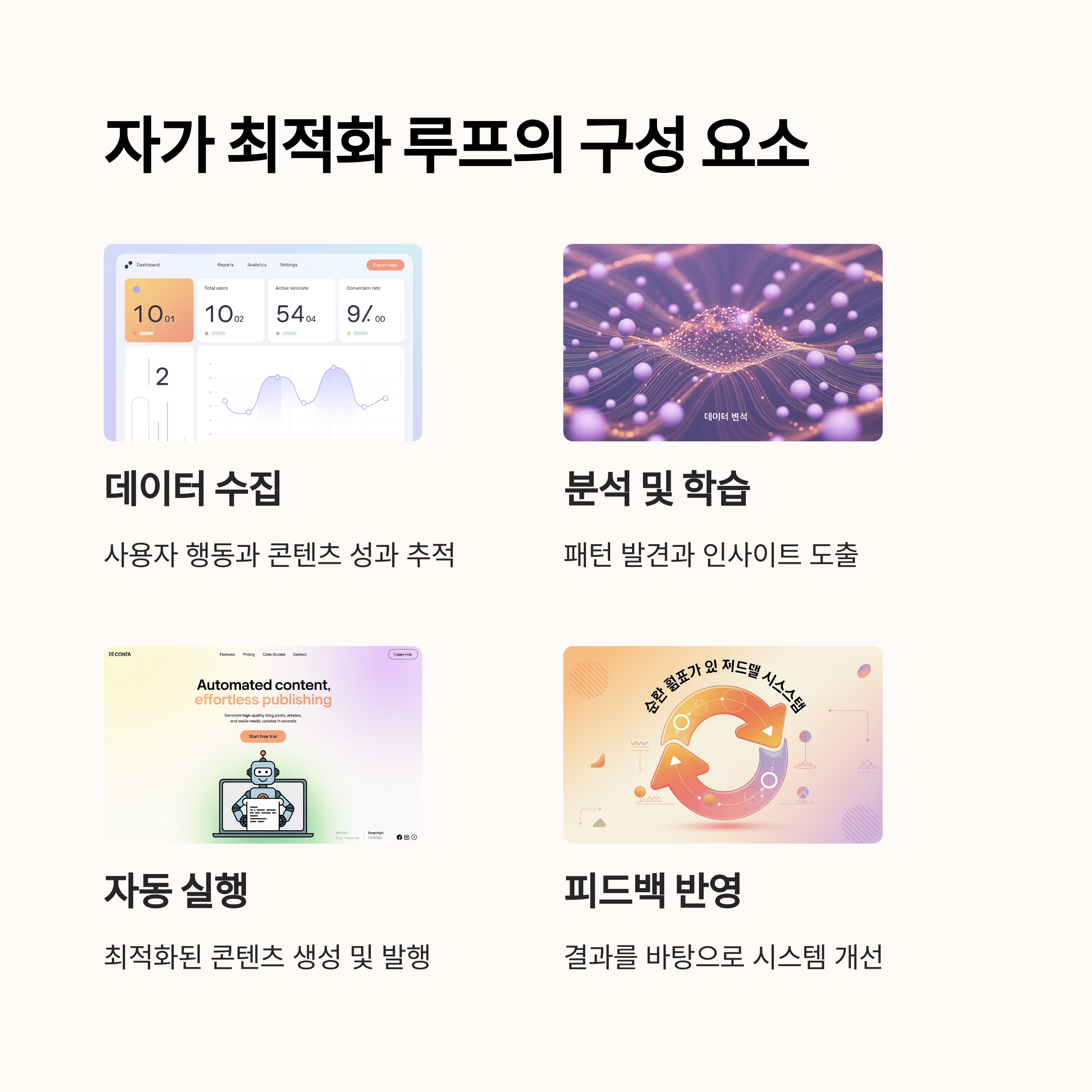 이 루프는 다음과 같은 방식으로 작동합니다. 성과 분석 → 콘텐츠 분류 → 리디자인 → 자동 배포 → 재분석의 순환입니다. 아래는 실제 시스템 구성 예시입니다.