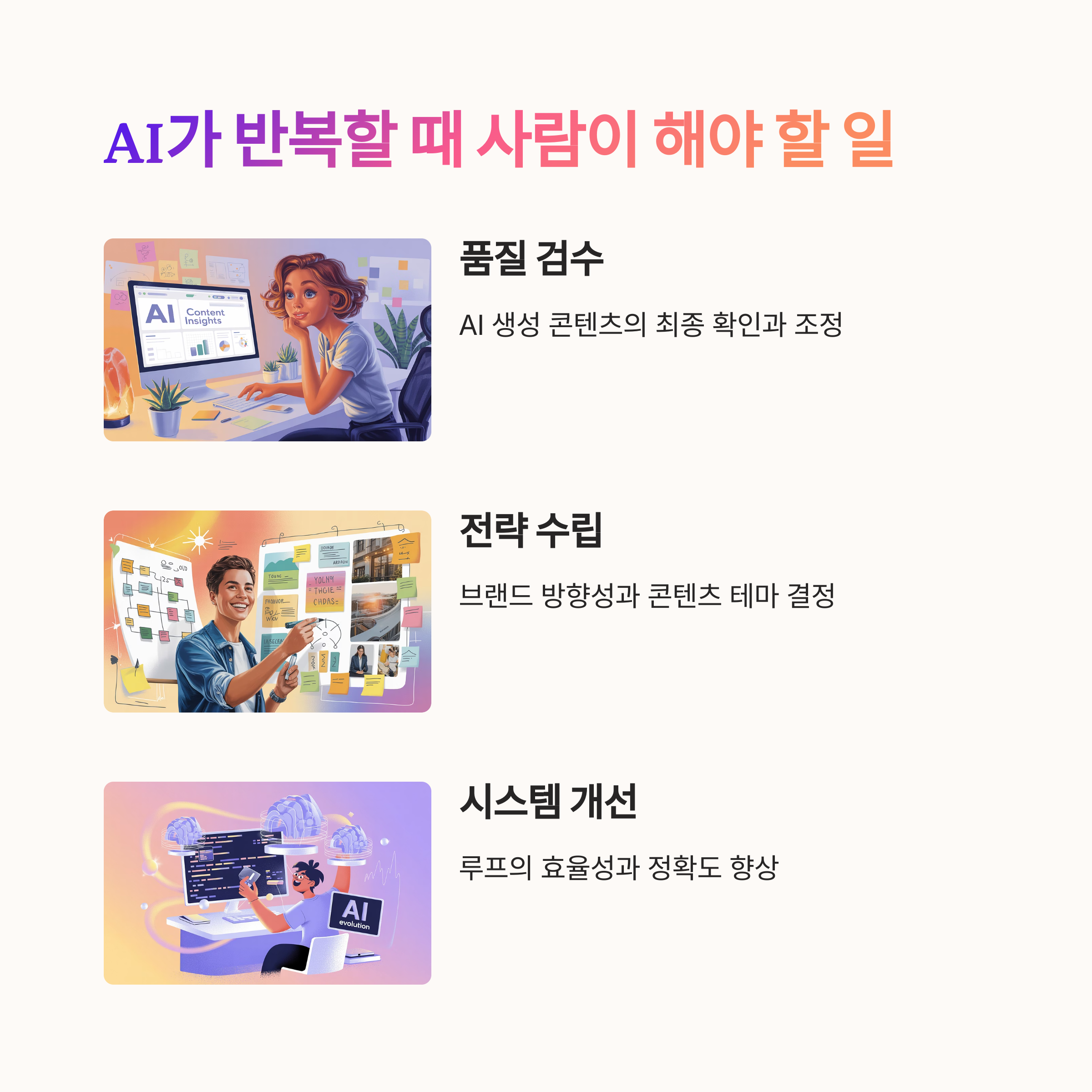 AI는 작업을 반복하지만, 방향을 설정하는 일은 사람만 할 수 있습니다. 자가 루프를 안정적으로 운용하려면 인간은 시스템의 틀을 만들고, 콘텐츠의 핵심 메시지를 결정하며, 브랜드 톤을 유지해야 합니다.