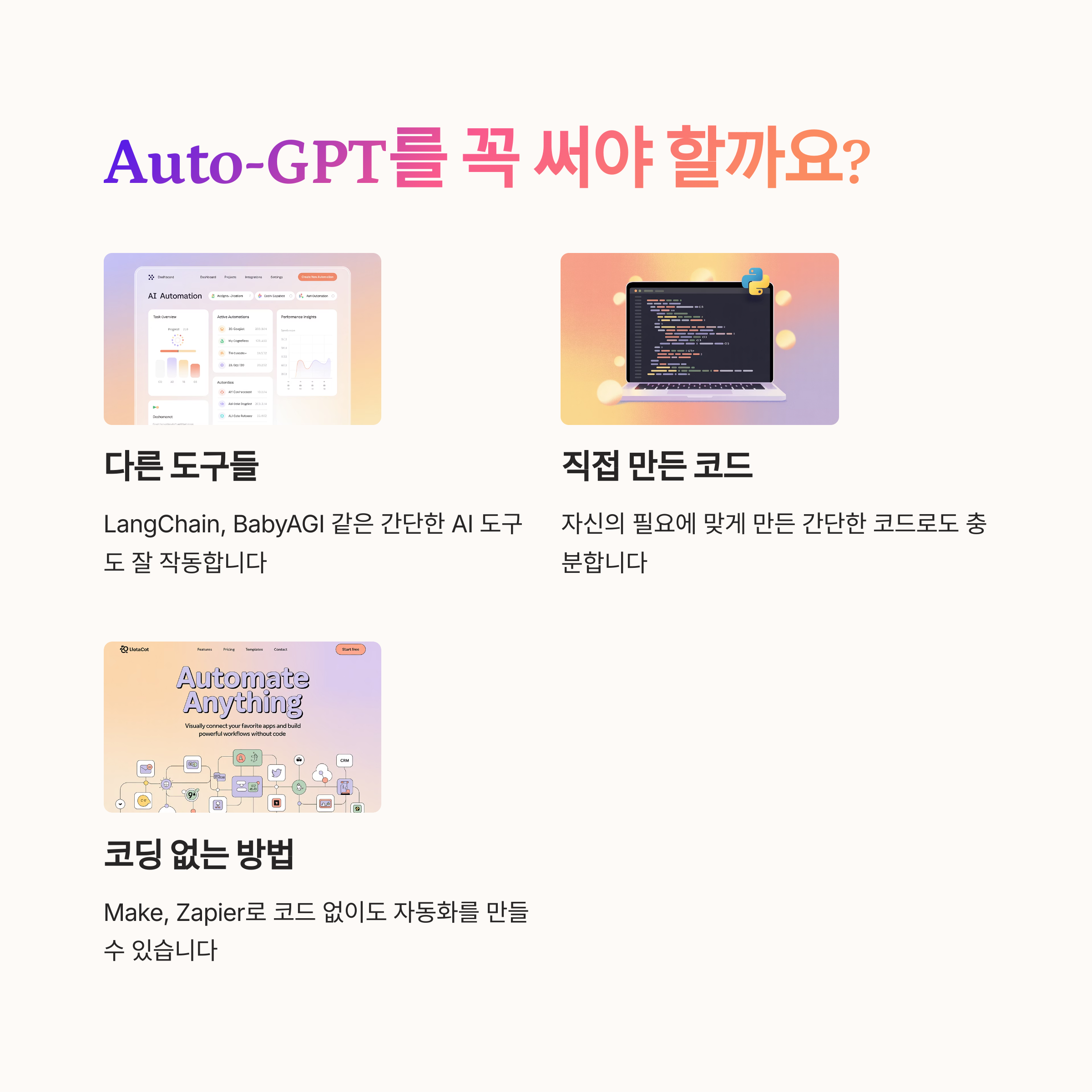 꼭 그렇지는 않습니다. Zapier, Make 등 자동화 툴과 GPT API 조합으로도 유사한 루프를 구현할 수 있습니다. Auto-GPT는 복잡한 태스크 조합에 적합합니다.
