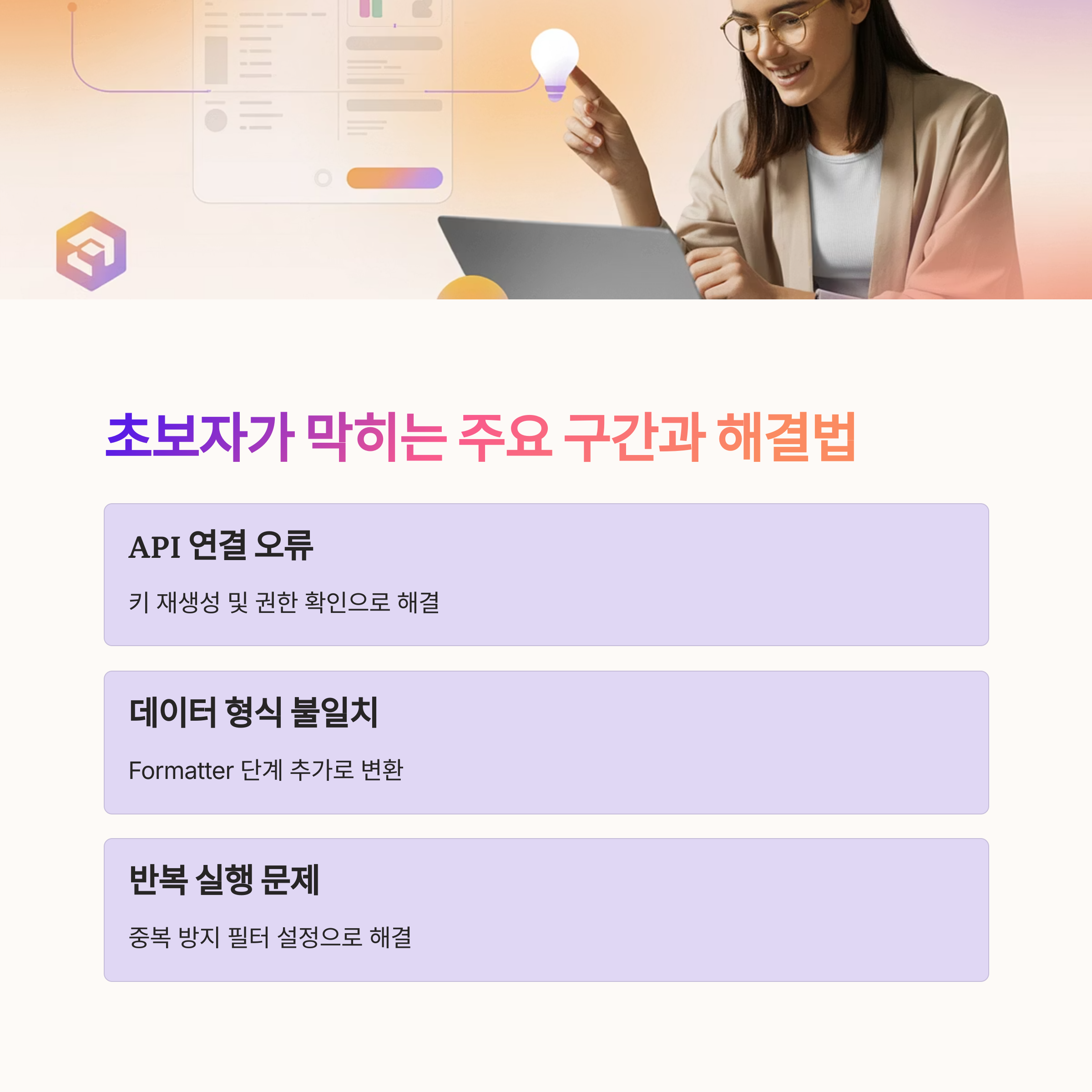 자동화 전략 글은 넘쳐나지만, 대부분 ‘개념적’ 설명에 그칩니다. Zapier가 뭐고 Notion API가 뭔지는 알겠지만, 실제 어떤 조건에서 어떤 데이터가 오가야 하는지는 빠져 있습니다. 특히 No-Code 사용자는 “API 키 설정”, “트리거 조건”, “필드 매핑” 같은 용어에서 막히고 실행을 멈추게 됩니다. 핵심은 개념이 아니라 구체적인 플로우입니다.