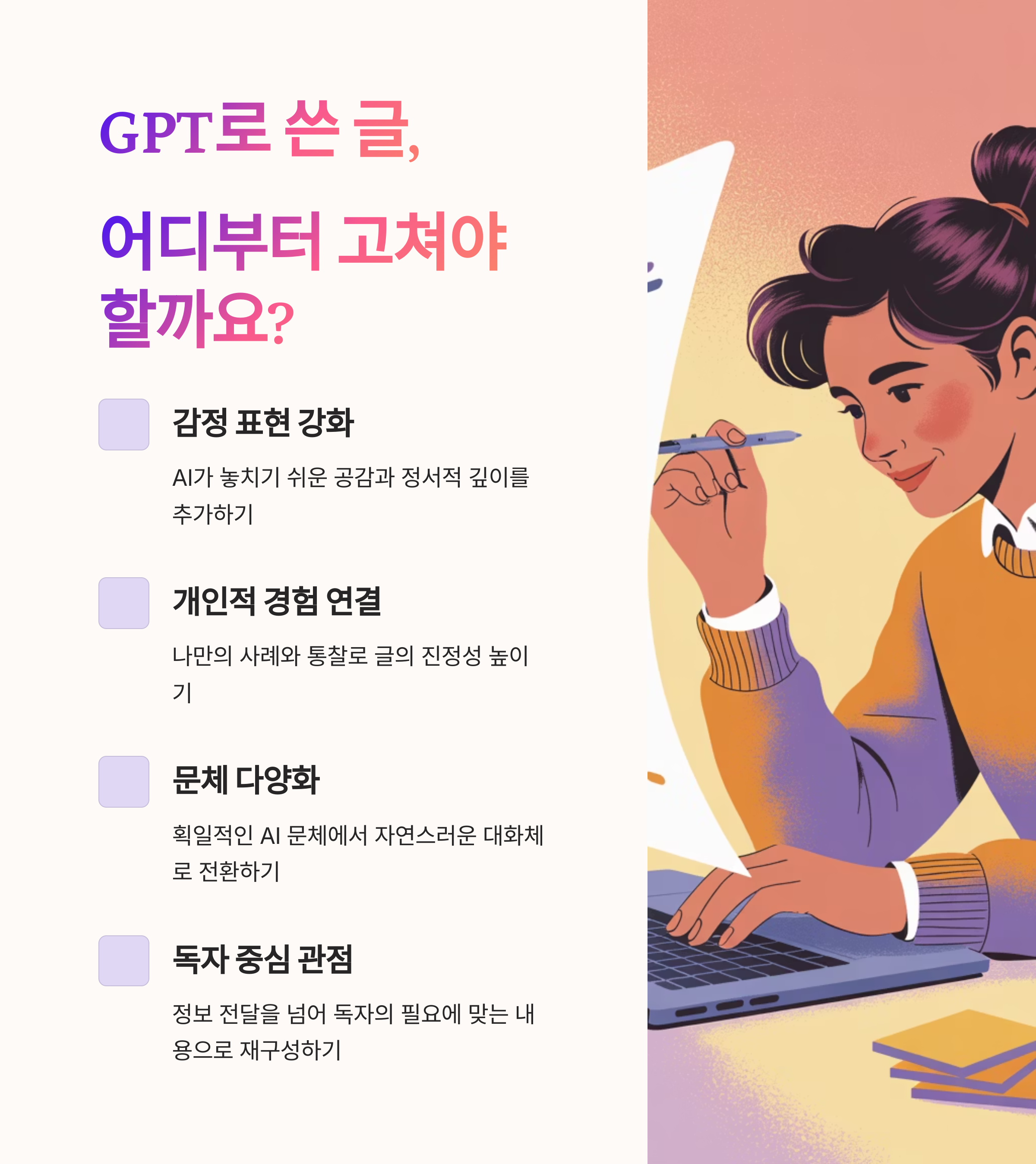 GPT 글을 사람 글처럼 바꾸려면 단순히 문장만 다듬는 게 아니라 감정 편집이 필요합니다. 다음 세 가지가 핵심이에요.