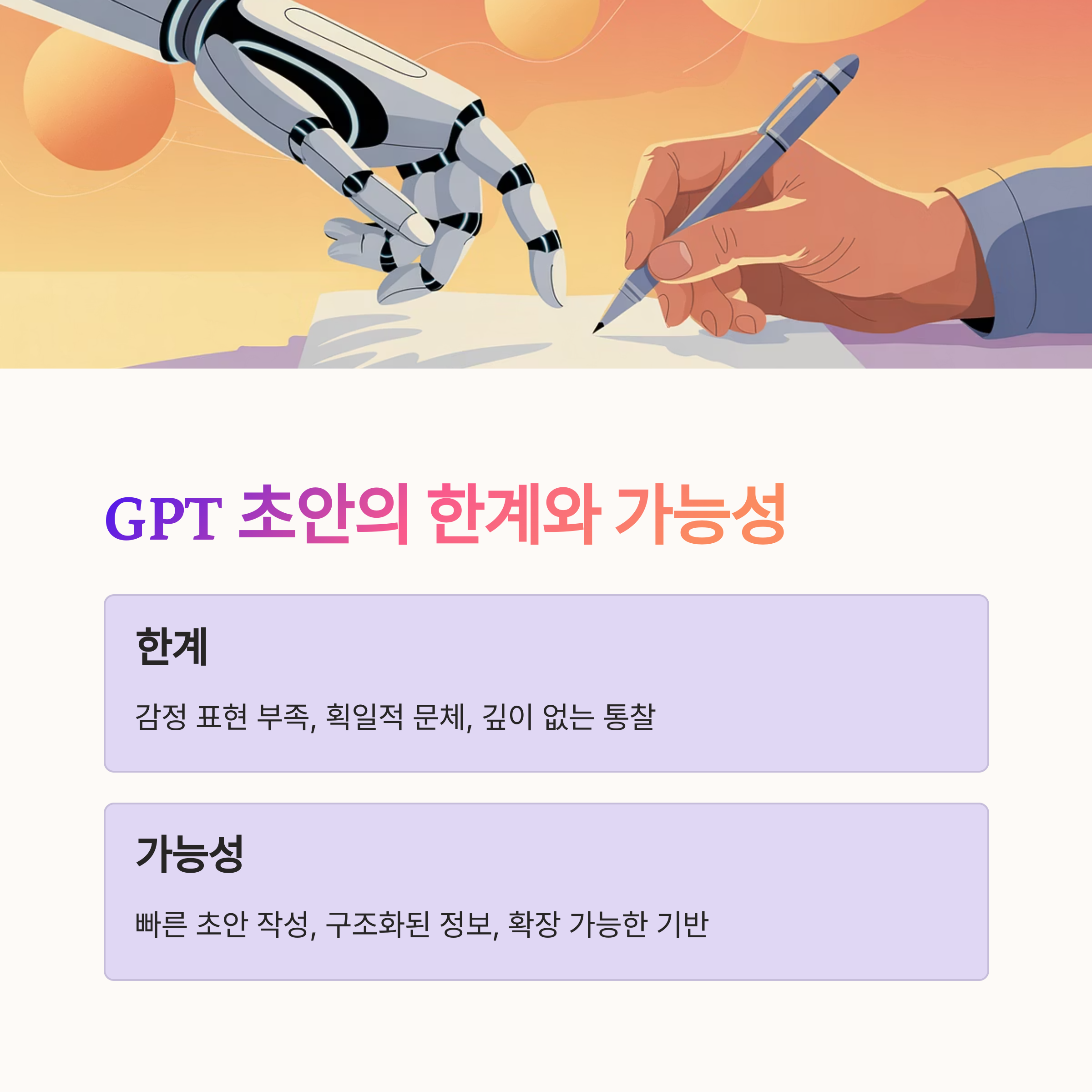 GPT는 초안 생성에 있어 매우 훌륭한 도구입니다. 구조도 잘 잡고, 정보도 풍부하죠. 하지만 글을 읽으면 알 수 있어요. “너무 잘 짜여 있어서 오히려 심심하다”는 느낌. 그게 바로 감정의 리듬이 없기 때문입니다. 아래 표는 GPT 초안의 장점과 한계를 비교한 것입니다.