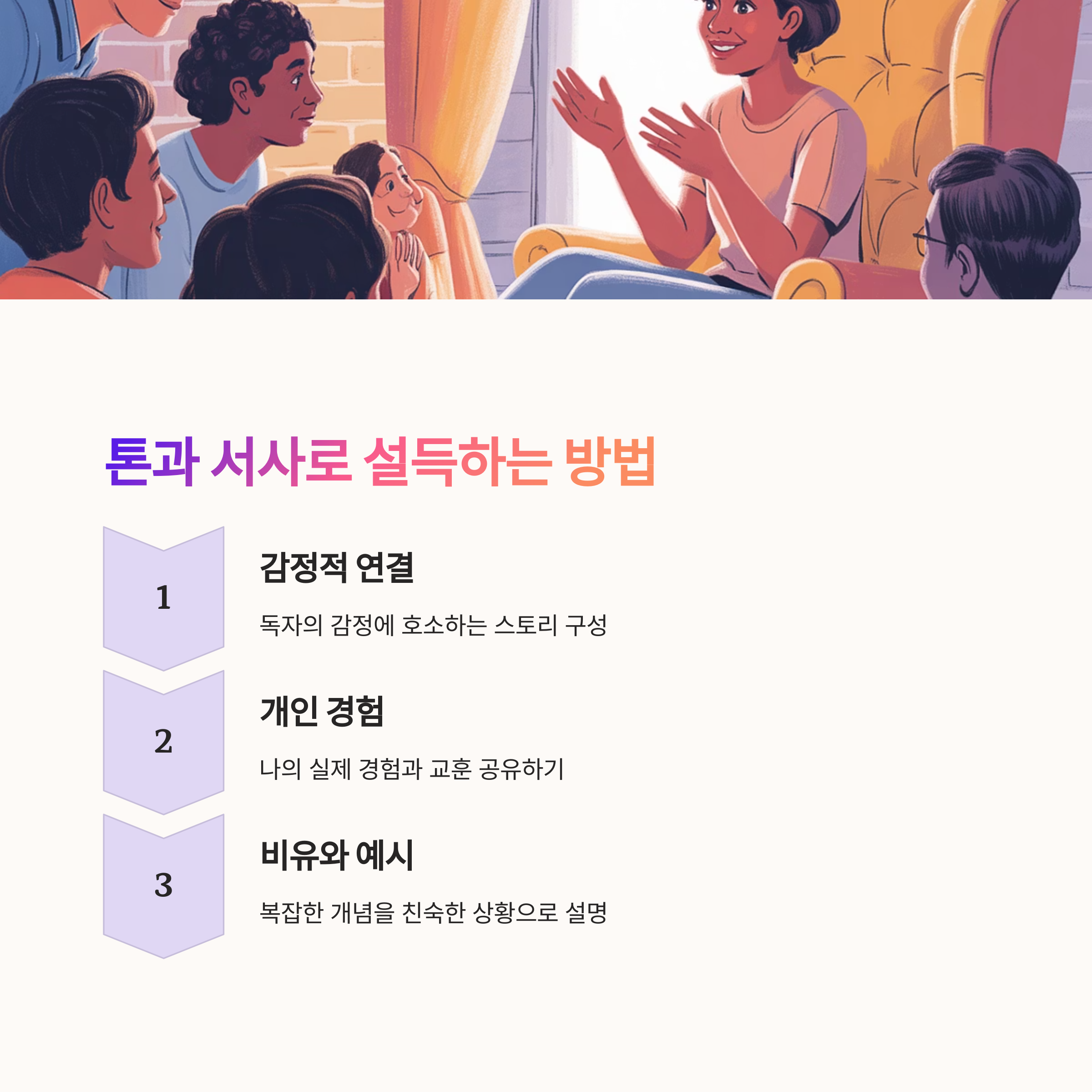 AI는 ‘정보’를 잘 전달하지만, 설득은 결국 ‘톤’과 ‘서사’에서 나옵니다. 말투가 단정하고 공감적일수록, 흐름이 이야기로 이어질수록 독자의 몰입도는 높아져요. 다음은 실제로 제가 적용해 효과를 본 서사 설계 구조입니다.