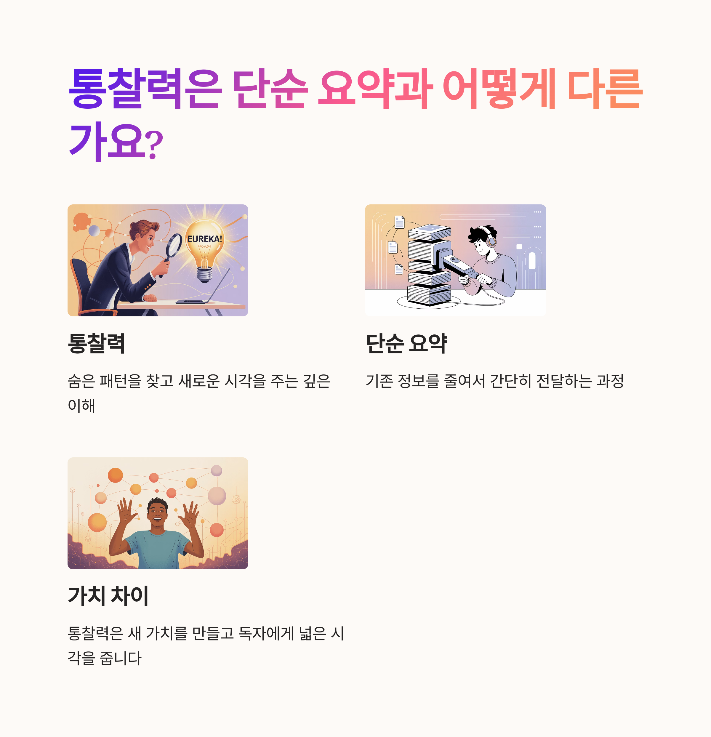 요약은 정보를 줄이는 작업이고, 통찰은 정보의 관계를 새롭게 보는 관점입니다. 통찰은 글을 읽는 사람의 사고방식을 확장시킵니다.