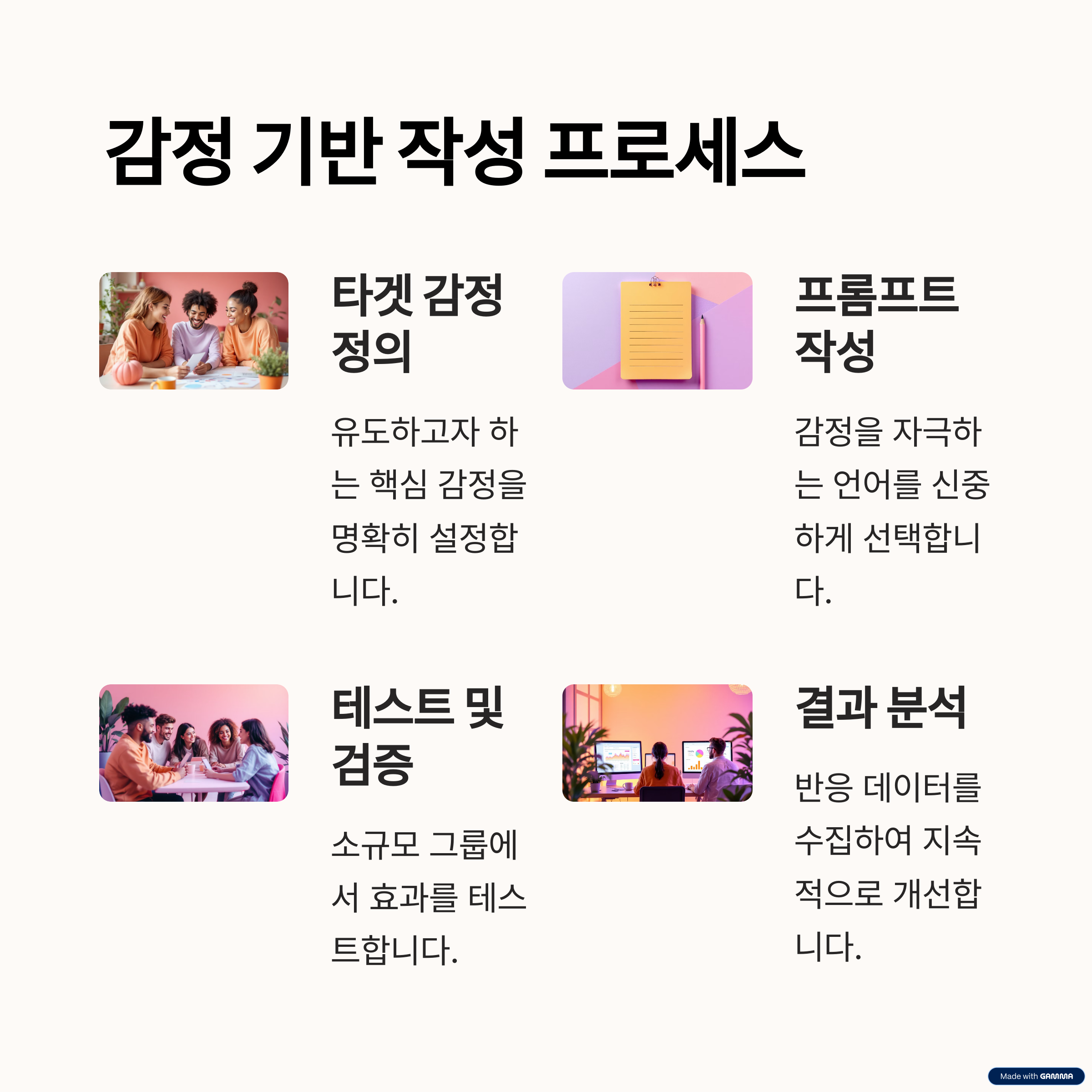 감정 중심의 프롬프트를 설계하려면, 다음의 5단계 프로세스를 참고해보세요. 단어보다 먼저, 감정을 설계하는 것이 핵심입니다.