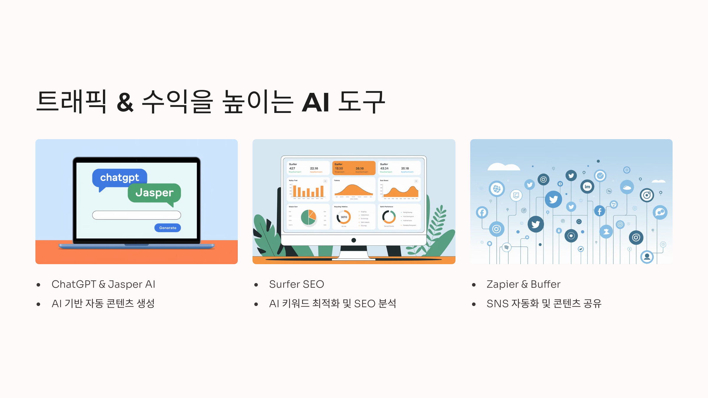 검색 엔진 최적화(SEO)부터 콘텐츠 생산, 트래픽 분석, 수익 모델까지 AI가 어떻게 경쟁력을 높이는지 확인하세요!"