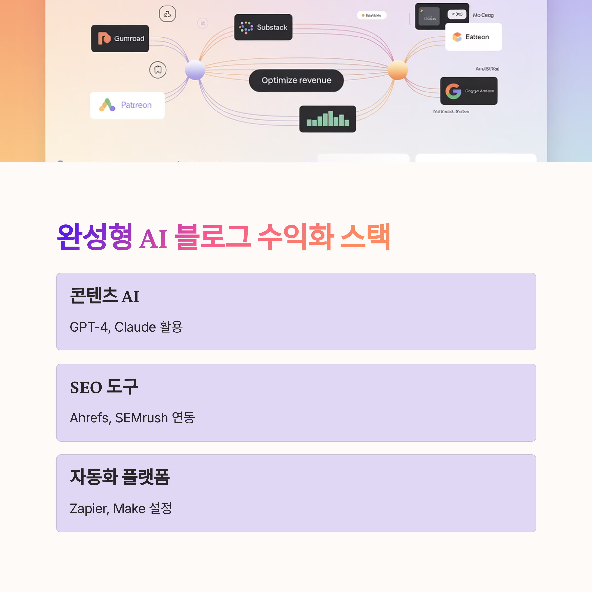 여기까지 따라오셨다면 이제 '자동화 블로그 수익 시스템'을 하나의 구조로 정리할 수 있어요. 아래처럼 스택을 구성하면, 자동화된 콘텐츠 생성 → 배포 → 수익화까지의 전체 흐름이 무한 반복됩니다.
