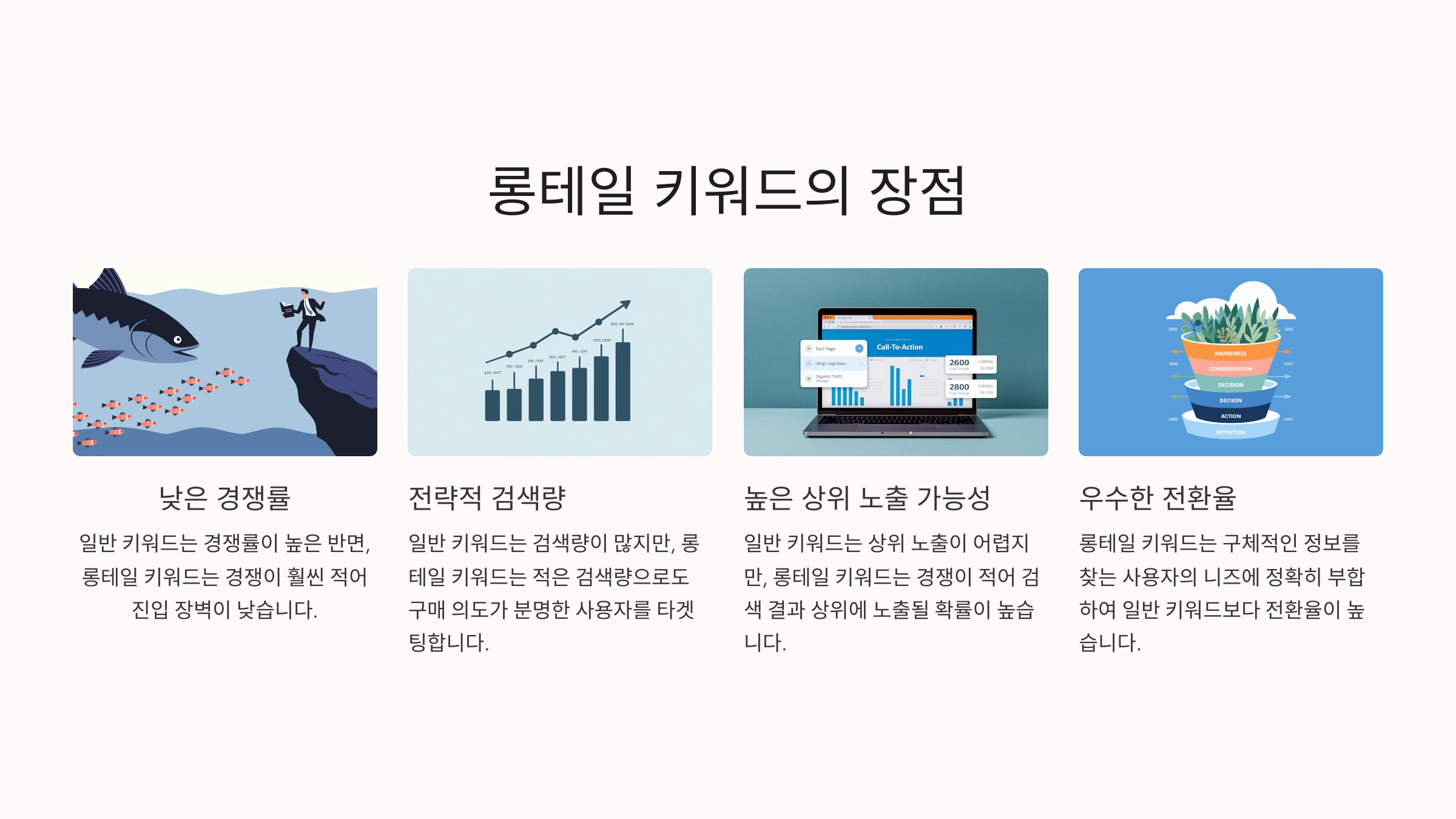 롱테일 키워드는 경쟁이 적고, **구체적인 검색 의도를 가진 사용자에게 노출될 확률이 높습니다.