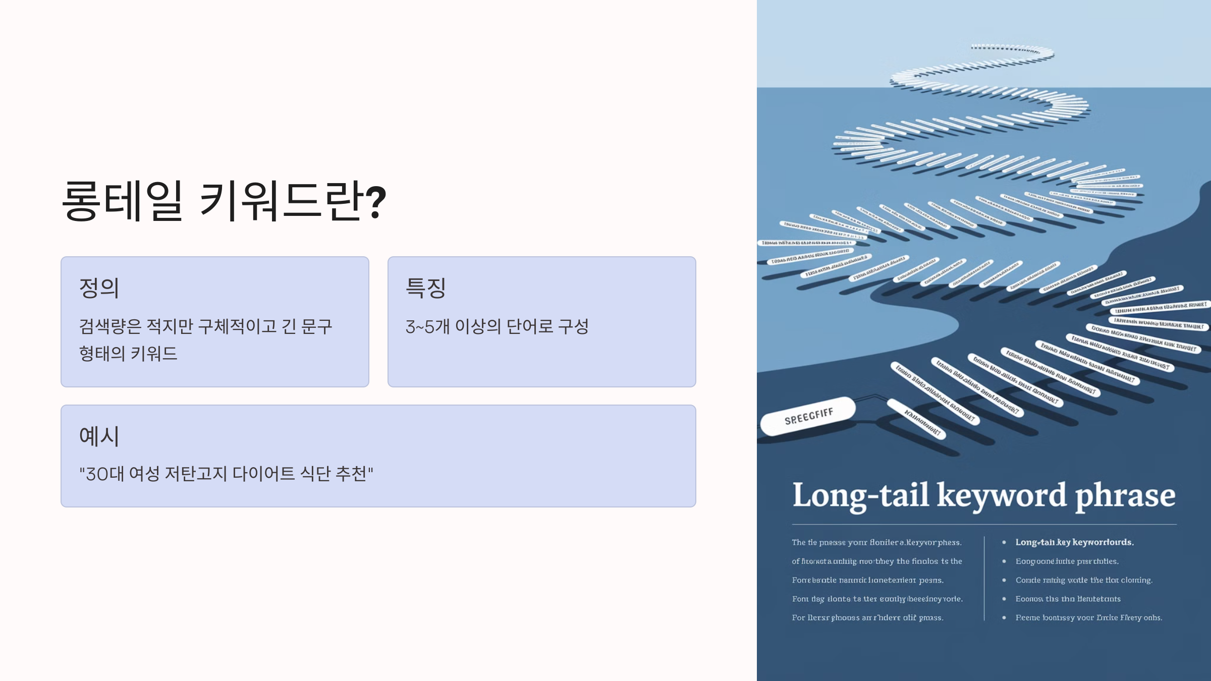 롱테일 키워드(Long-tail Keywords)란 검색량은 적지만 **구체적이고 긴 문구 형태의 키워드**를 의미합니다.