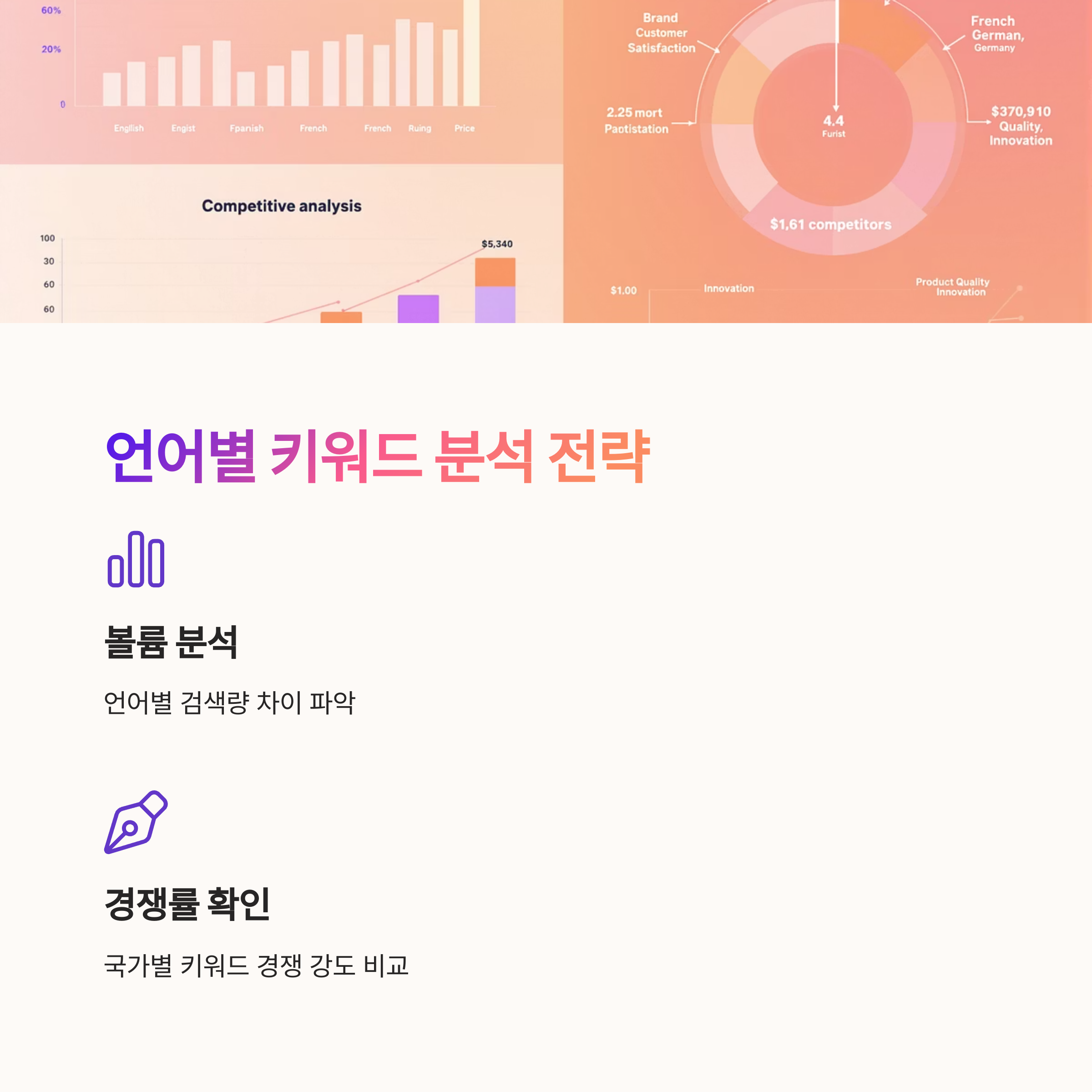 단순히 키워드를 번역하면 실패 확률이 높아요. 예를 들어, 영어 ‘remote work’와 일본어 ‘テレワーク’은 비슷하지만 검색량과 사용자 의도가 달라요. 저희는 언어별로 아래 항목을 기준으로 분석합니다.