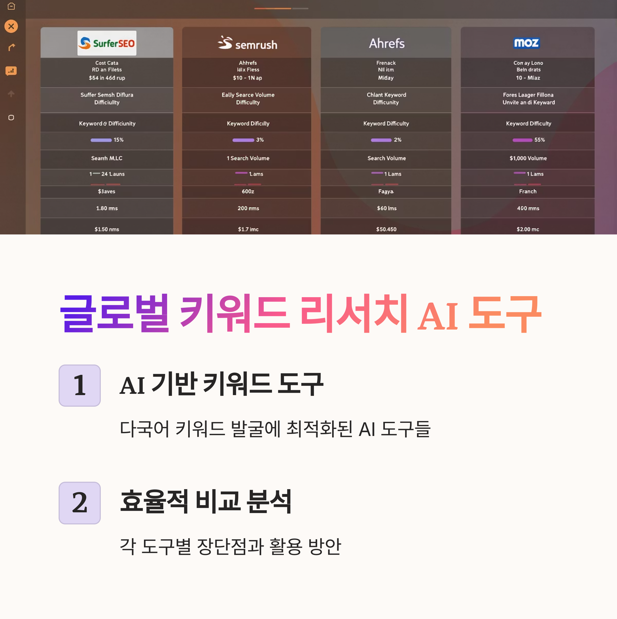 국가별 키워드 리서치는 단순 번역으로는 한계가 있어요. 저희는 AI 기반 도구를 사용해 언어 특성, 검색 습관, 경쟁률까지 자동 분석합니다. 가장 효과적이었던 툴 4가지를 비교하면 아래와 같습니다.