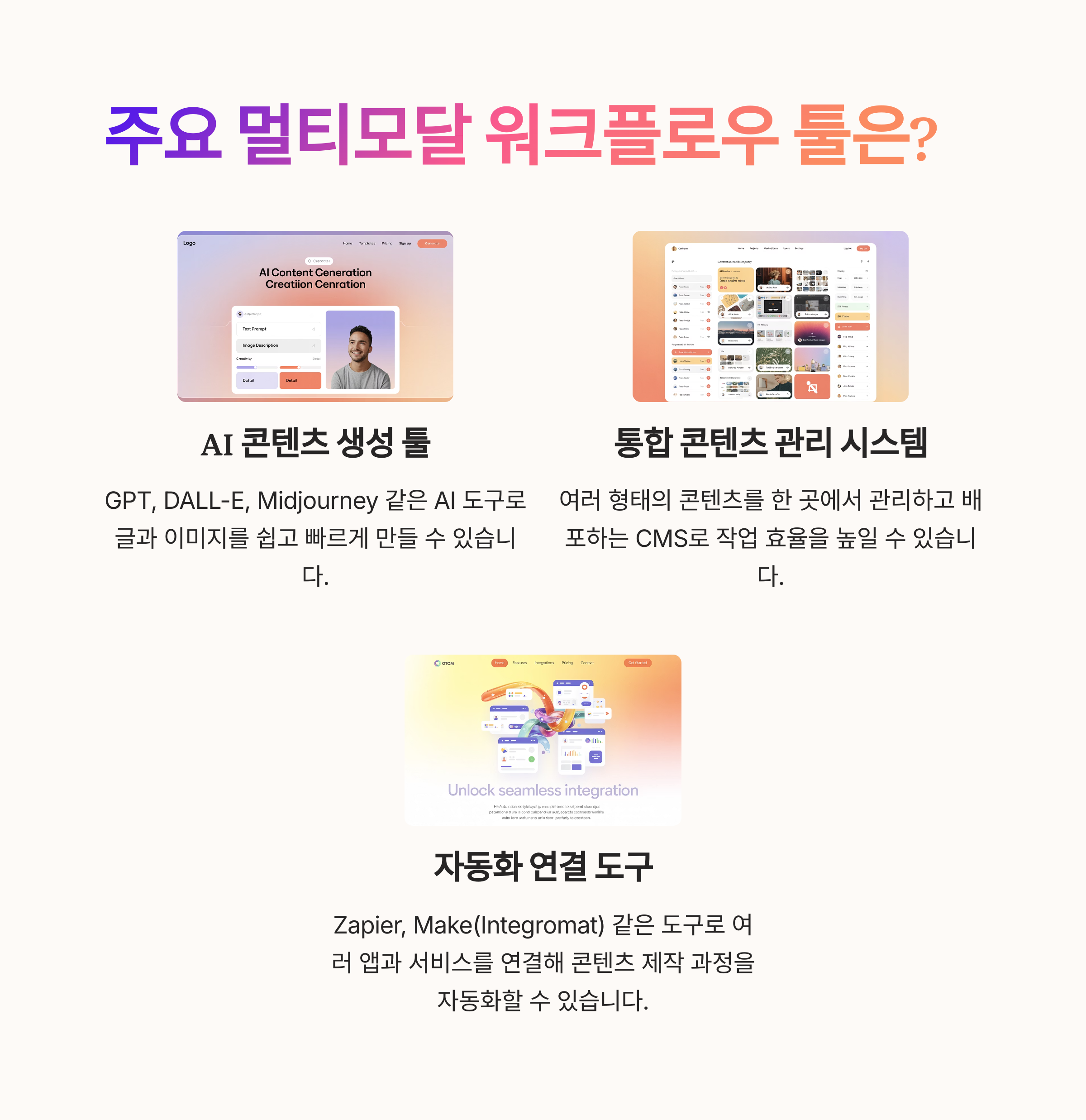 미드저니·DALL·E(이미지), 클로바더빙·ElevenLabs(음성), Zapier·IFTTT(자동화), 캔바·프리미어(통합 작업) 등이 대표적입니다.