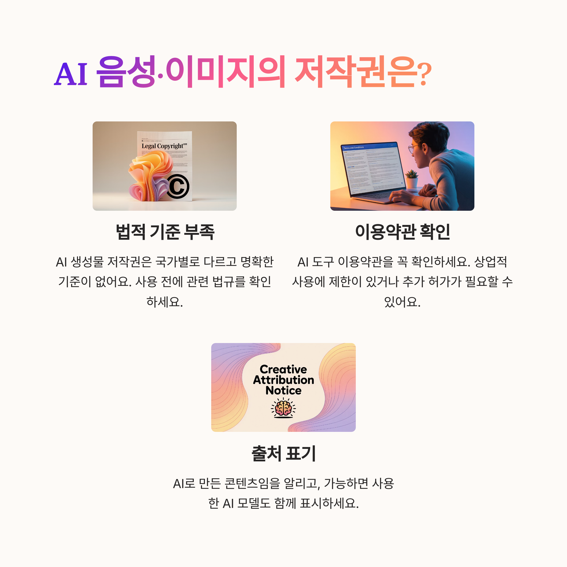 AI 생성물은 대부분 자유롭게 활용 가능하지만, 상업적 사용 전엔 각 툴의 저작권 정책을 꼭 체크해야 합니다.