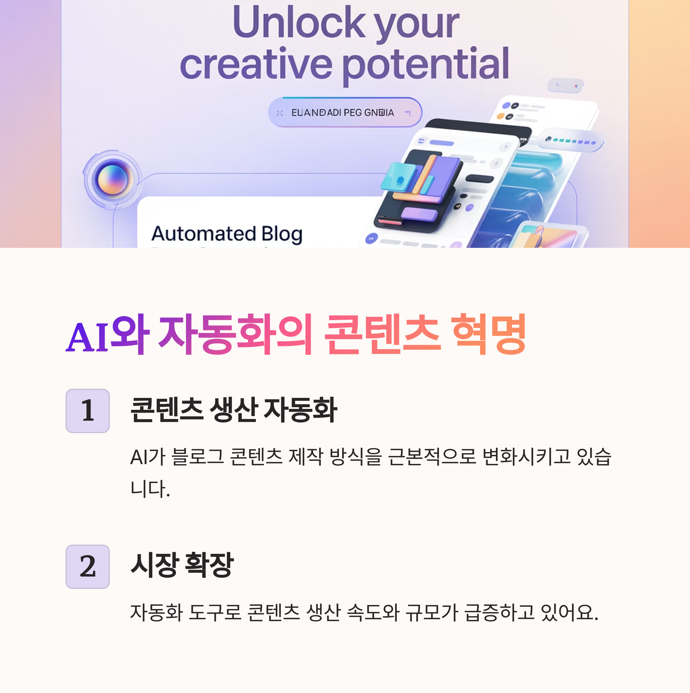 2024년부터 본격화된 AI 콘텐츠 자동화 시장은 이제 ‘툴 경쟁’이 아닌 ‘콘텐츠 품질 경쟁’으로 옮겨가고 있습니다. 더 이상 "AI가 썼어요"는 경쟁력이 되지 않아요. 오히려 "AI + 인간의 감성 + 목적형 설계"가 조합된 콘텐츠가 각광받고 있습니다. 특히 블로그에서는 AI로 초안을 만들고, 운영자가 감정선과 스토리를 입히는 방식이 보편화될 전망이에요.
