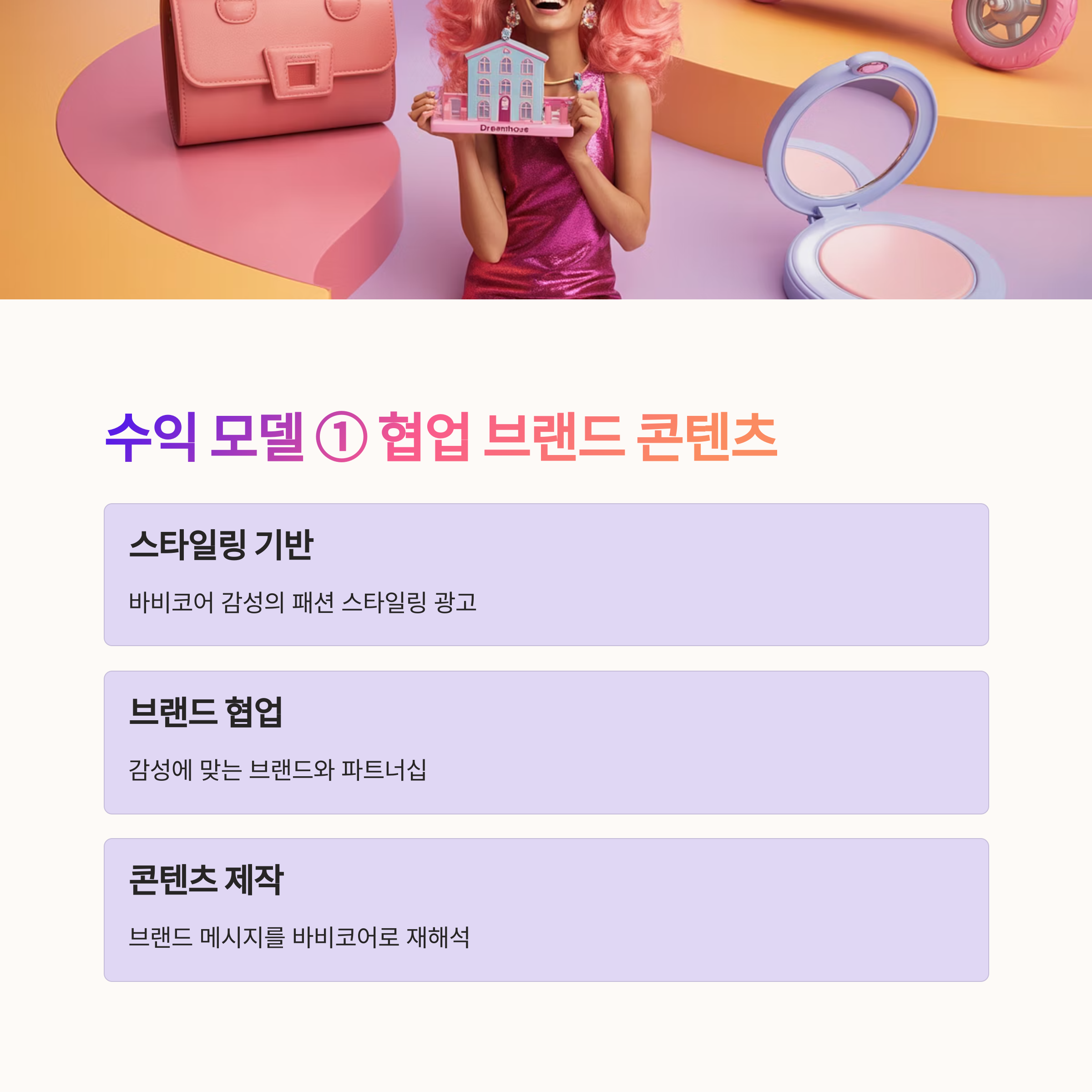가장 전통적인 수익화 모델이지만, 바비코어는 여기에 정서 기반 스타일링 광고라는 새로운 무드를 더했습니다. 룩북, 변신 릴스, AI 스타일링 영상에 브랜드 협찬을 연결하면, 소비자는 “이건 광고”가 아니라 “이건 나도 갖고 싶은 감정”이라고 느낍니다.