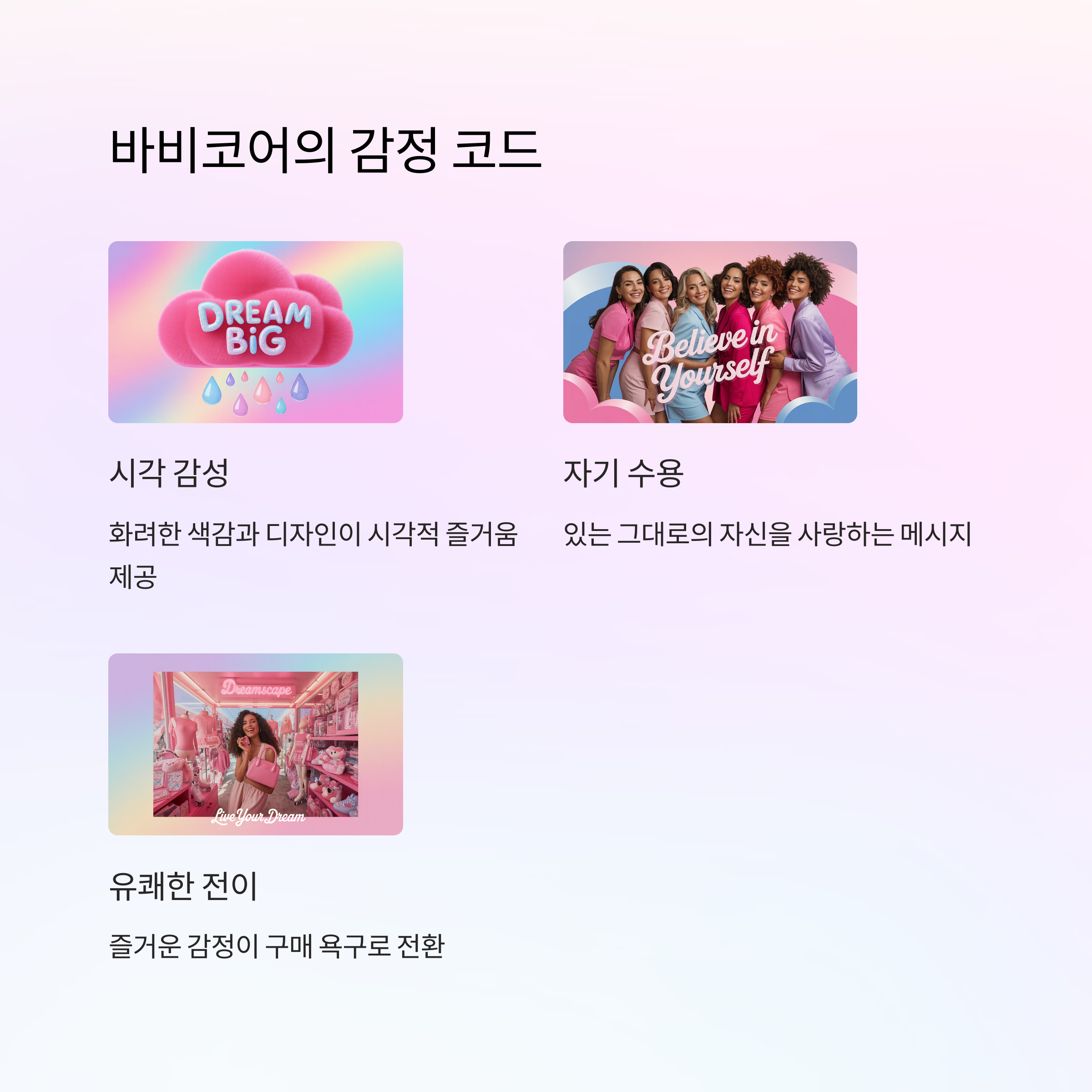 바비코어 콘텐츠는 하나의 정서적 쇼트필름입니다. 그 짧은 순간에 감정이 유입되고, 몰입되며, 자기화되는 경험이 숏폼 내에서 자연스럽게 완결됩니다.