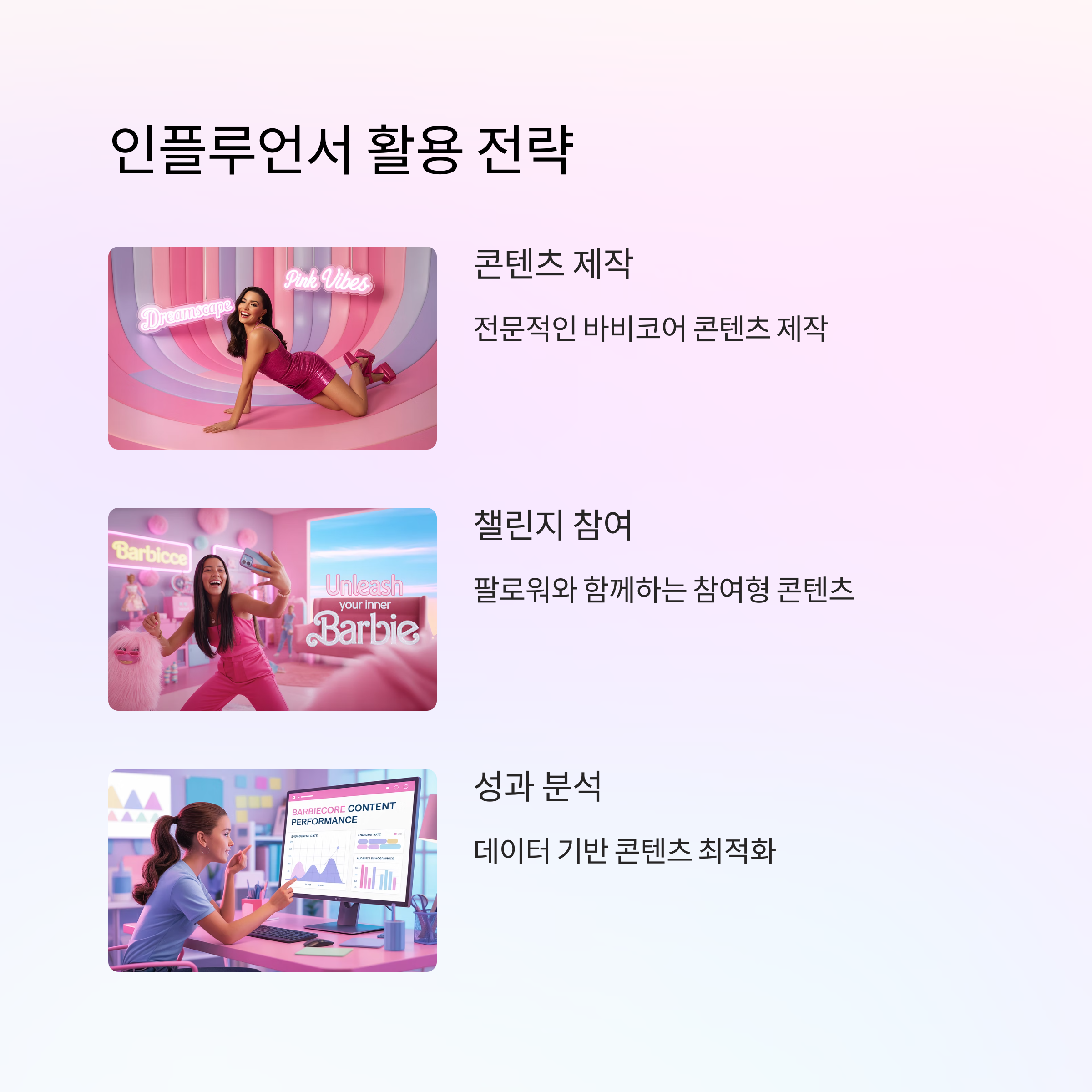 - BGM: 트렌딩 오디오 활용 + #barbiecore 해시태그 병행