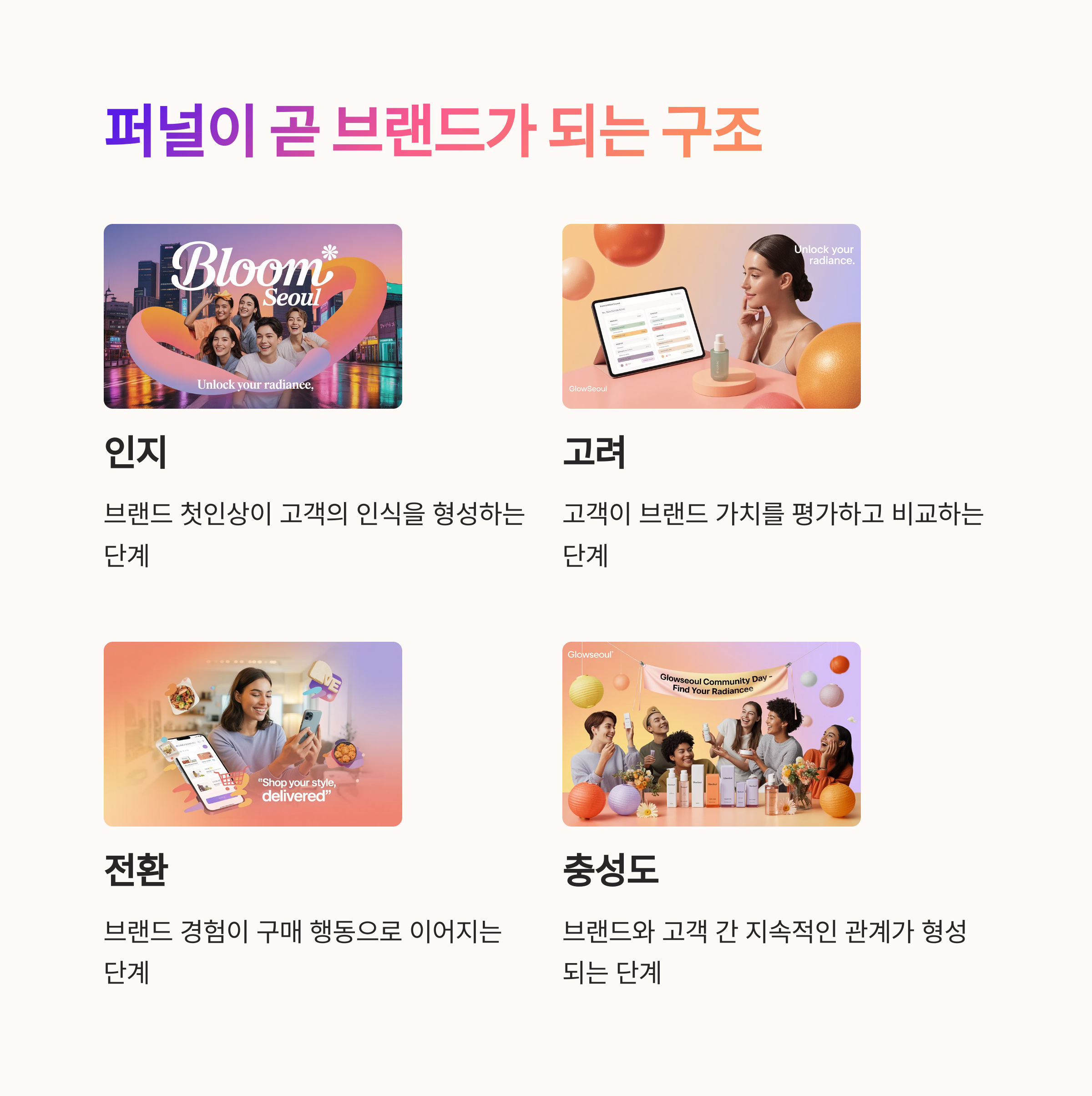이 데이터를 기준으로 브랜드는 전환 퍼널이자, 반복되는 정체성 구조로 확장됩니다. 콘텐츠가 곧 시스템이자 비즈니스가 되는 방식입니다.