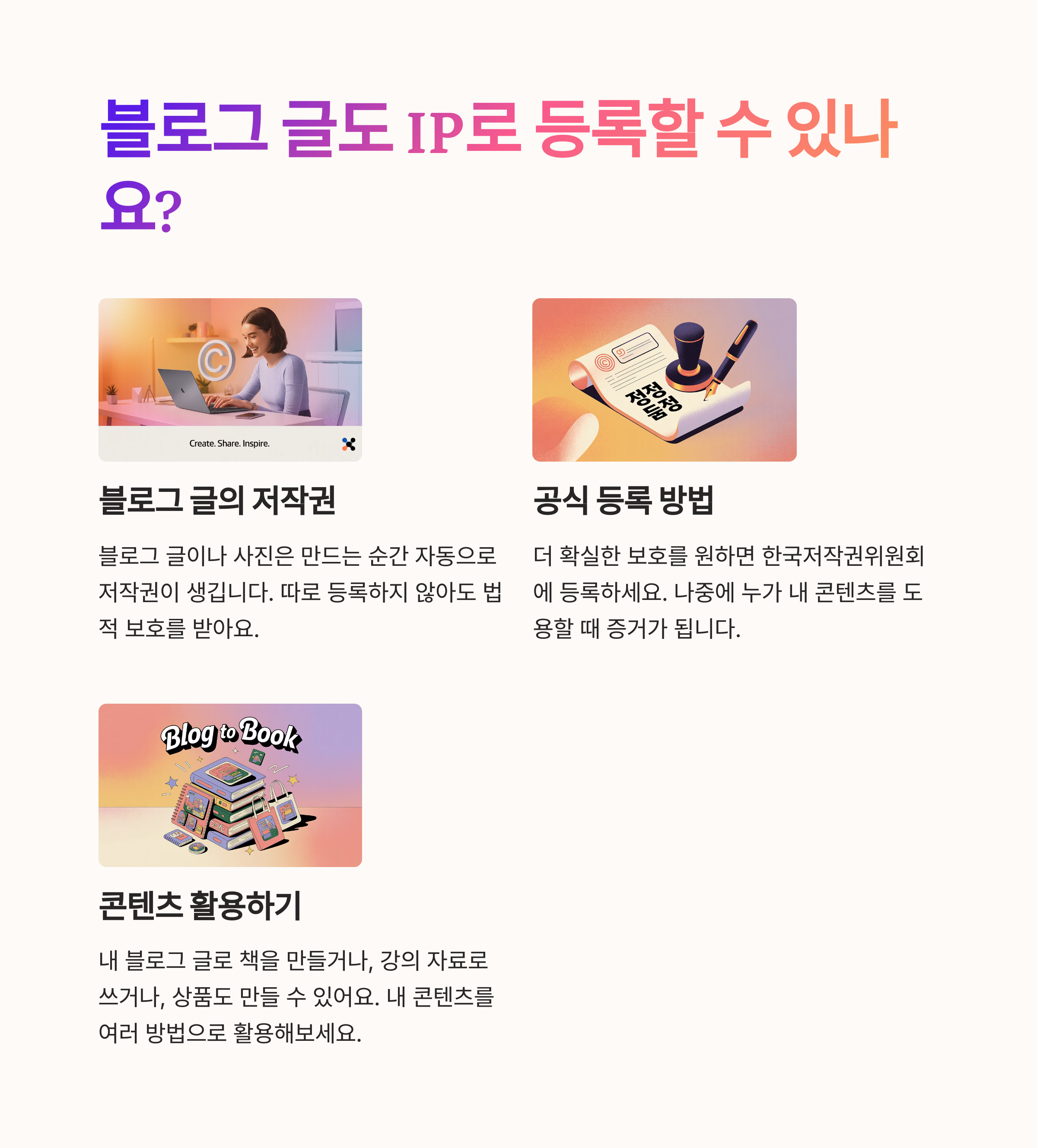 그동안 쌓인 블로그 글, SNS 콘텐츠… 그냥 두시겠어요? 지금부터는 IP로 바꿔 수익을 두 배로 만들어보세요!