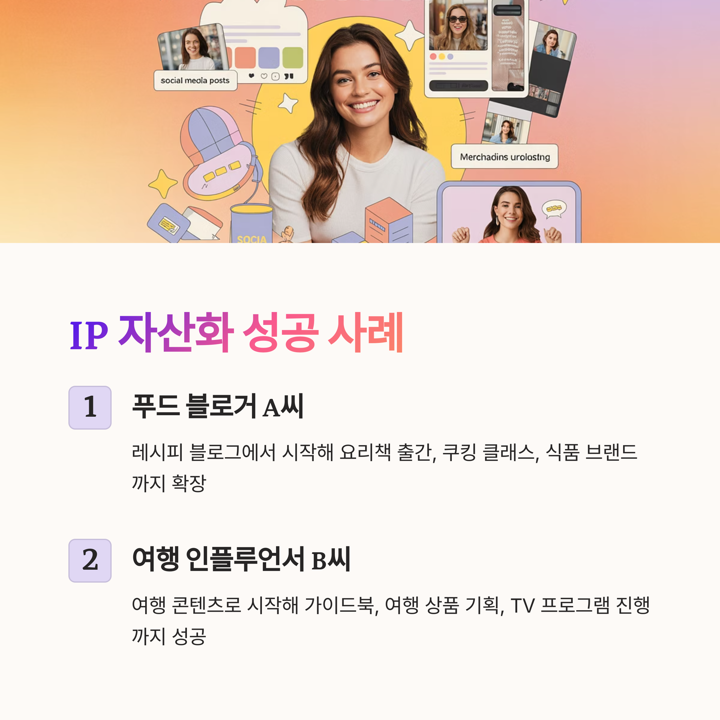 블로그를 운영하면서 SNS도 꾸준히 병행해왔는데요, 어느 날 보니 콘텐츠가 1000개를 훌쩍 넘더라고요. 그런데 그 수많은 콘텐츠를 어떻게 활용해야 할지 막막했어요. 그러다 ‘콘텐츠 IP’라는 개념을 접하고, 라이선싱과 2차 수익화 전략을 배우기 시작했죠.