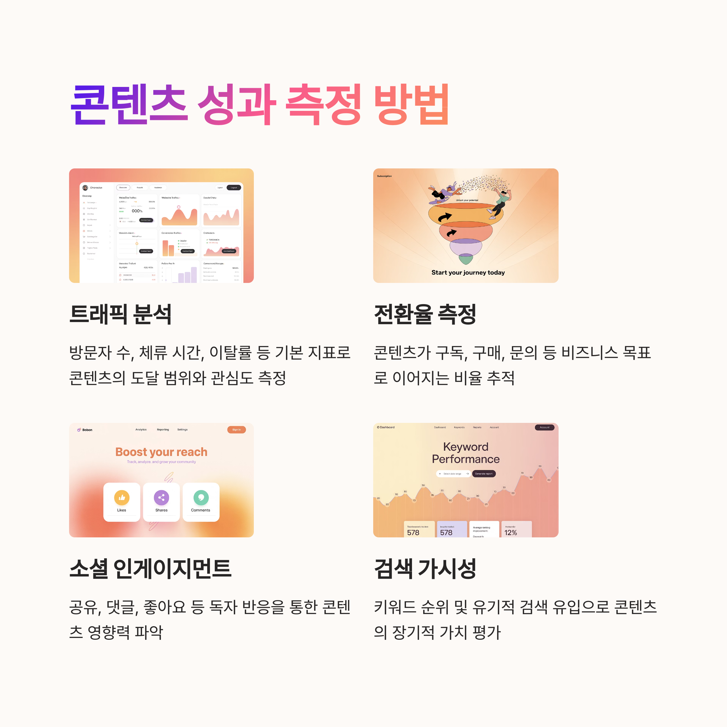 자산화된 콘텐츠는 단순히 많이 본 글이 아니라, 시간이 지나도 꾸준히 트래픽과 전환을 만들어내는 글입니다. 단발성 이슈 글은 일시적 반응에 그치지만, 자산화 콘텐츠는 검색, 공유, 링크, 재활용이 가능한 형태로 구조화되어 있죠. 이 글이 어떤 ‘문제’를 해결하고 있는지, 어떤 ‘문맥’ 속에서 소비되는지 명확할수록 자산화 가능성은 높아집니다.