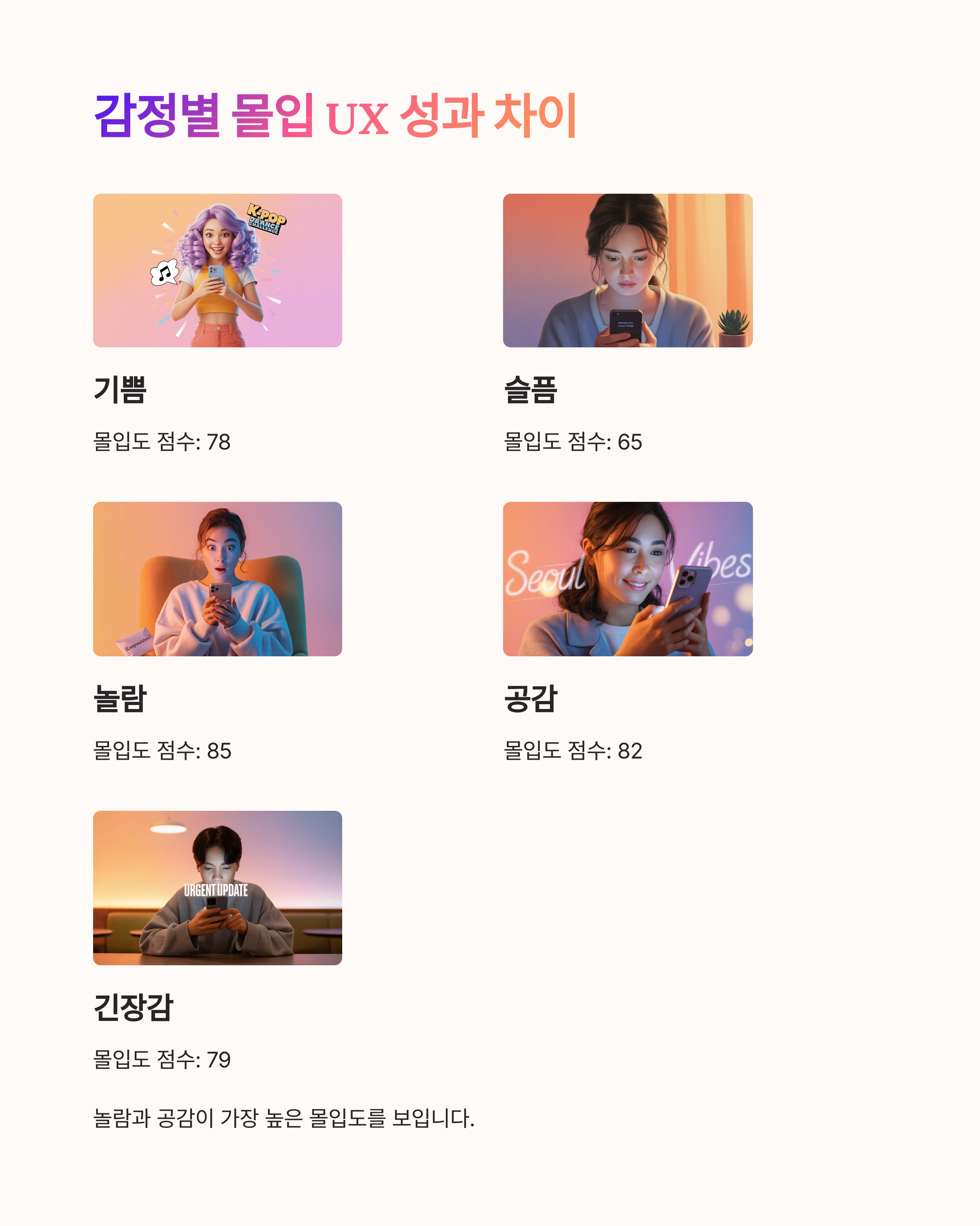 각 감정이 사용자 행동에 미치는 영향은 정량적으로도 확인할 수 있습니다. 아래는 동일 주제의 숏폼에 서로 다른 감정 리듬을 적용했을 때 나타난 UX 성과 차이 예시입니다.