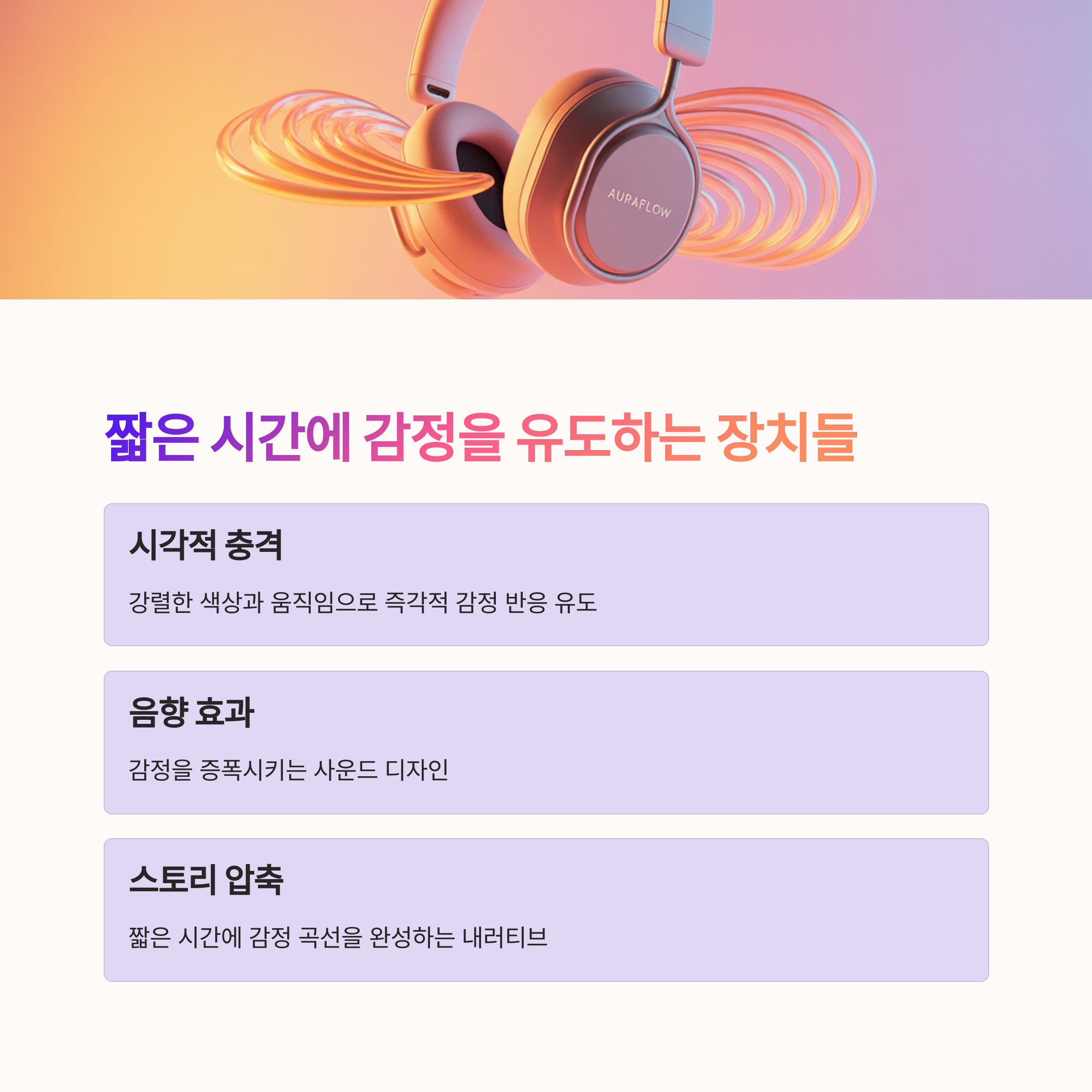 짧은 시간 안에 감정을 포착하기 위해서는 영상 내 장치들이 ‘정서적 코드’를 빠르게 전달해야 합니다. 특히 시청자의 감각을 자극하거나, 몰입 유도 리듬을 활용하는 방식이 효과적입니다.