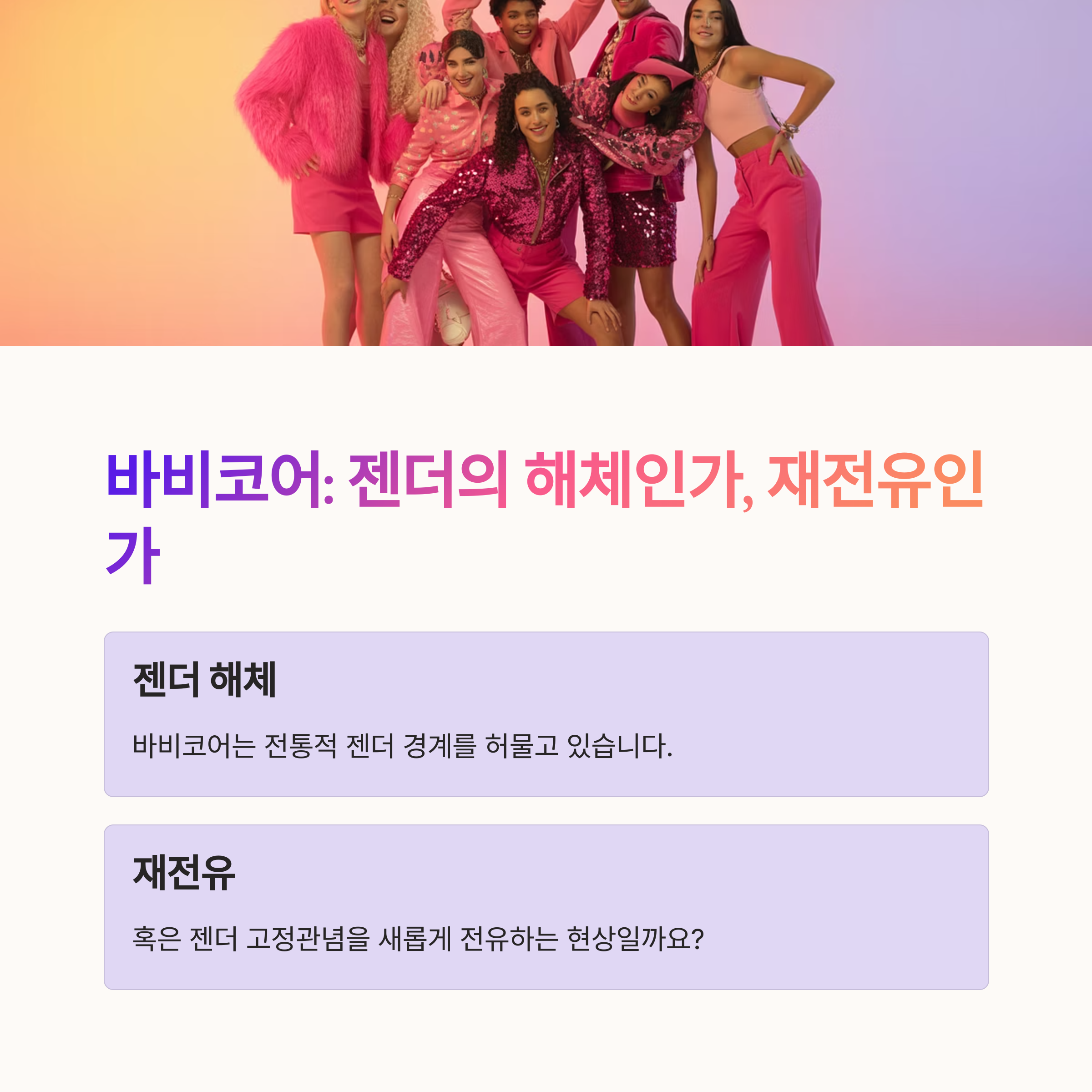 바비코어는 단순히 ‘여자다운’ 트렌드가 아닙니다. Z세대는 이를 정체성 실험 도구로 삼고 있으며, 그 안에서 젠더는 고정된 특성이 아니라 ‘하루의 분위기처럼 바꾸고 연기할 수 있는 스타일’이 되어가고 있습니다.