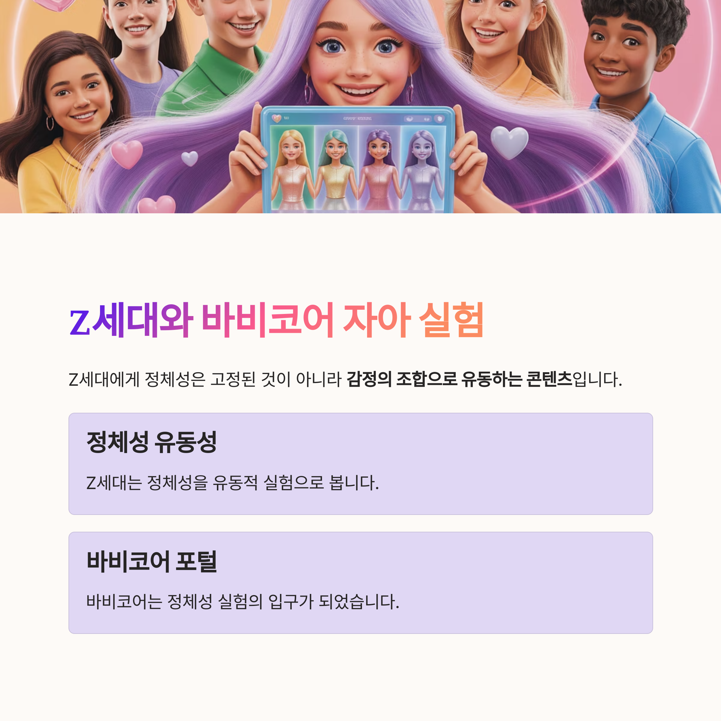 Z세대에게 정체성은 고정된 것이 아니라 감정의 조합으로 유동하는 콘텐츠입니다. 바비코어는 그 정체성 실험의 포털이었고, 그 감정의 리듬은 숏폼 알고리즘과 정확히 맞물렸습니다. 이제 기획자는 단순한 트렌드보다, 감정 구조, 자아 설계, 알고리즘 리듬을 통합적으로 기획해야 합니다. 바비코어 이후의 세대는, 감정과 정체성의 ‘디자이너’만이 살아남습니다.