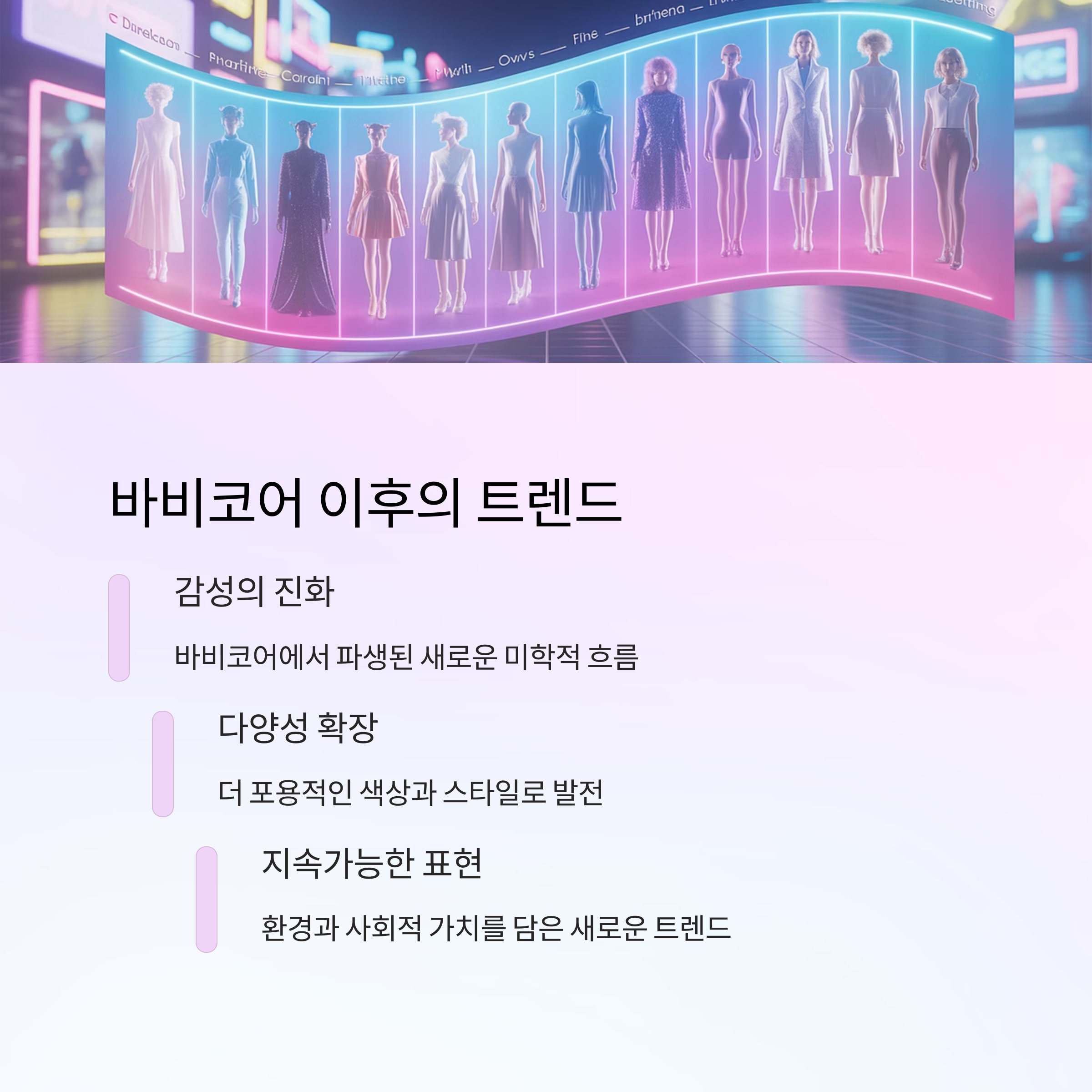 바비코어는 단순히 유행했던 스타일이 아닙니다. 그것은 감성을 시각화한 언어였고, 정체성을 전달한 문화 코드였습니다. 트렌드는 바뀌어도, 그 기반에 있는 ‘내가 누구인지 보여주고 싶은 욕망’은 바뀌지 않습니다.