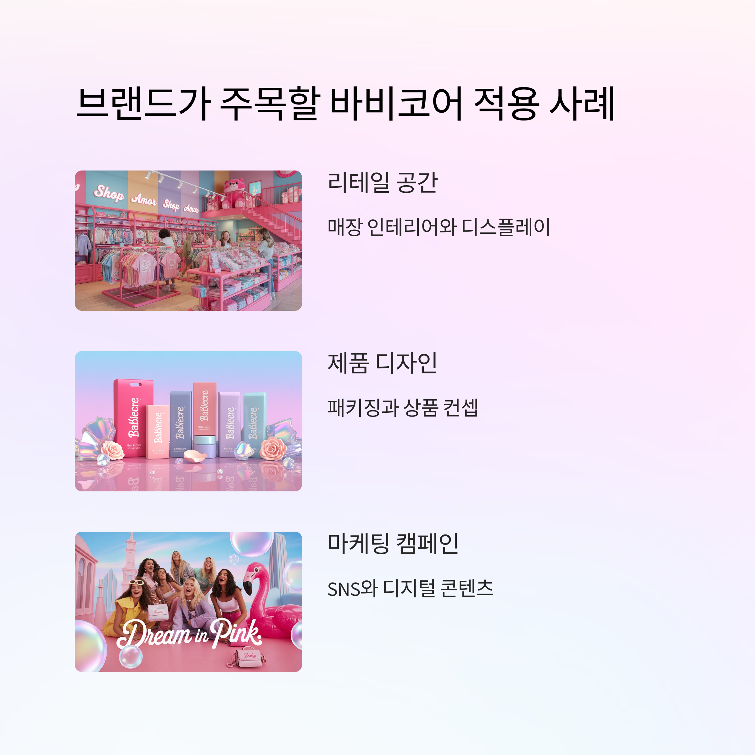 이처럼 바비코어는 Z세대 정체성 소비의 상징적 언어로 기능하며, 패션, 뷰티, SNS 콘텐츠, 브랜디드 영상까지 전방위로 확장되고 있습니다.