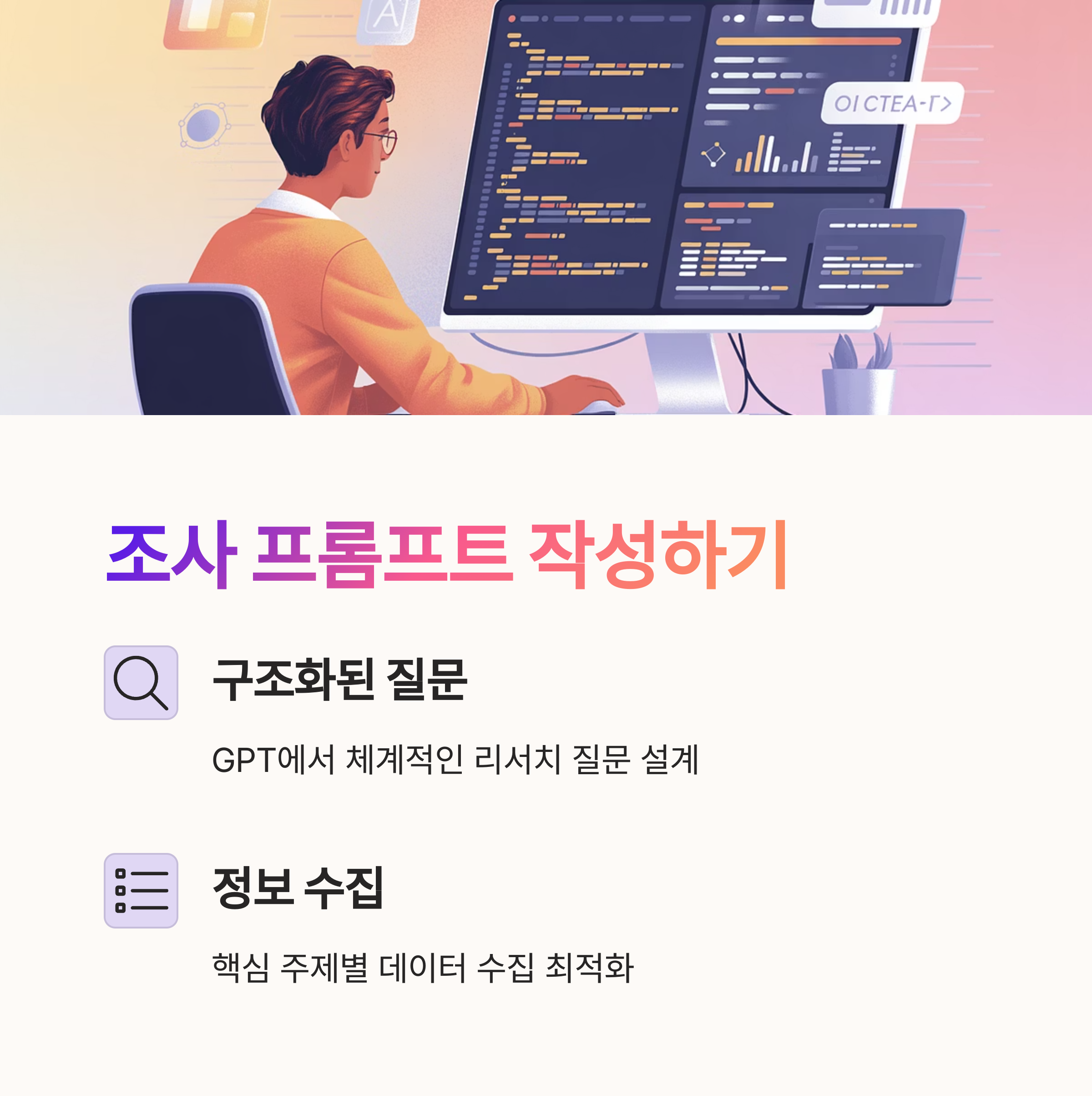 기획과 리서치의 출발점은 '좋은 질문'입니다. GPT를 활용하면 단순 정보 요청이 아니라, 논리적 구조와 인사이트 도출이 가능한 수준 높은 **리서치 프롬프트**를 설계할 수 있습니다.