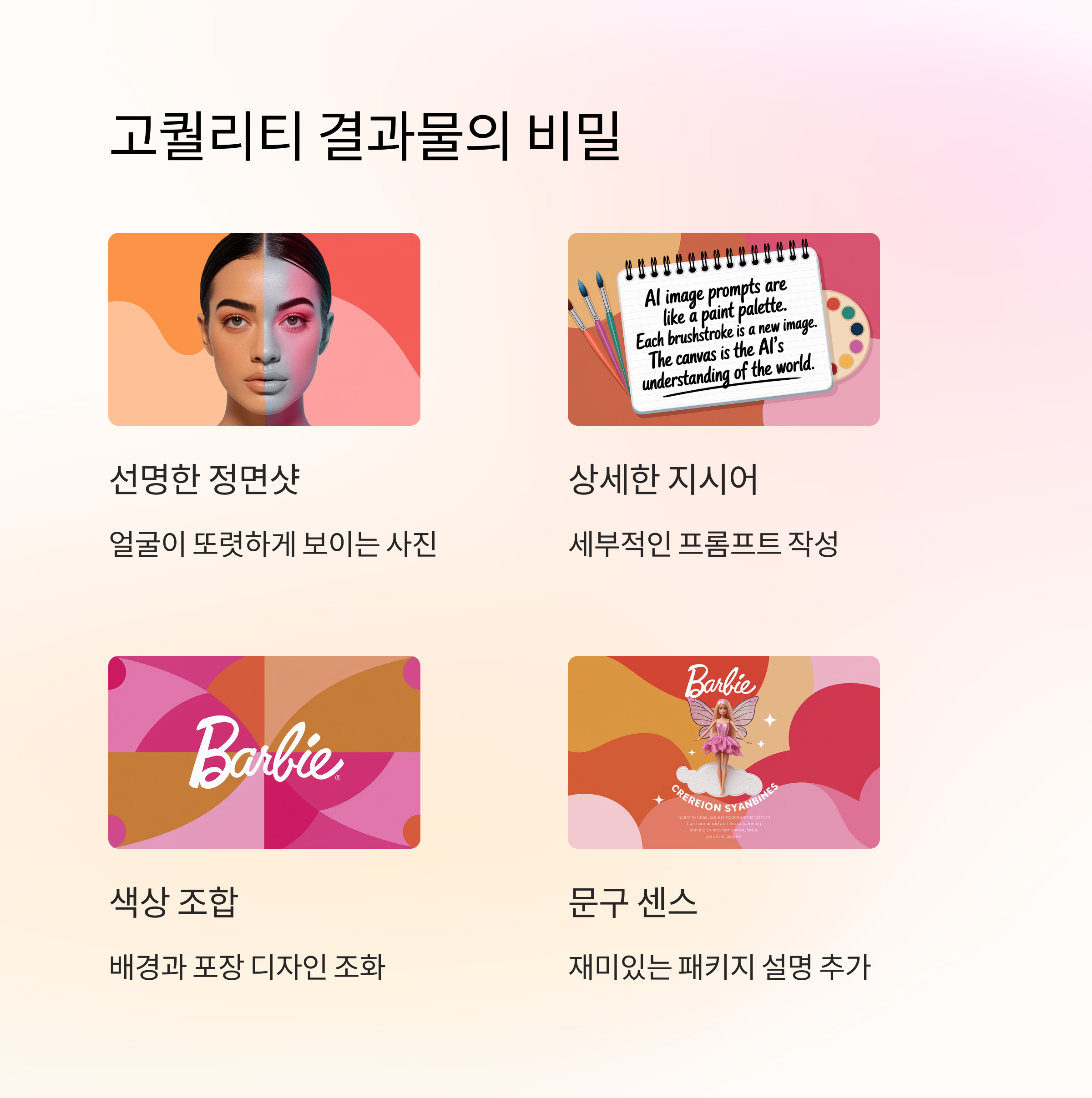 프롬프트 설정도 매우 중요합니다. 단순히 "바비 인형처럼 그려줘"보다는 “투명 플라스틱 박스에 포장된 캐릭터처럼, 인형은 핑크 블레이저를 입고, 스마트폰과 이어폰이 포함되어 있어” 같이 구체적인 프롬프트를 사용하는 것이 핵심입니다. 배경 색상도 감성을 살리기 위해 핑크, 민트, 연보라 등 파스텔 계열을 적극 활용하는 것이 좋습니다. 이렇게 작성된 프롬프트는 이미지 생성 시 높은 만족도를 보장해줍니다.