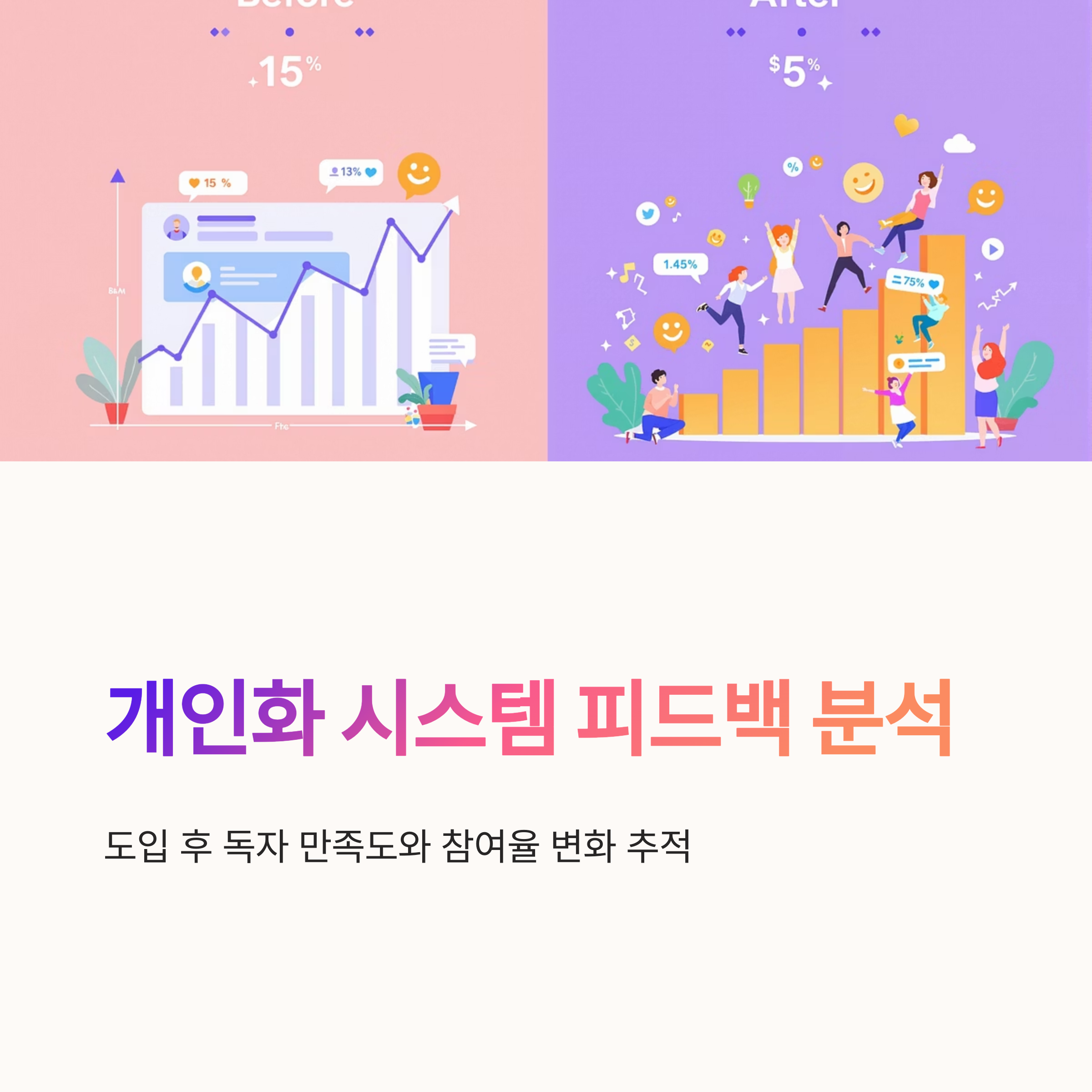 초개인화 시스템을 3개월간 실험한 결과, 댓글 수 2.3배 증가, 평균 체류 시간 1.7배 증가, 오픈율 18% → 32%로 상승했습니다. 반면 초기엔 “너무 인위적이다”, “로봇 느낌 난다”는 피드백도 있었죠. 하지만 사용자 맞춤 콘텐츠가 반복되자 감정 연결도 더 강해졌습니다.