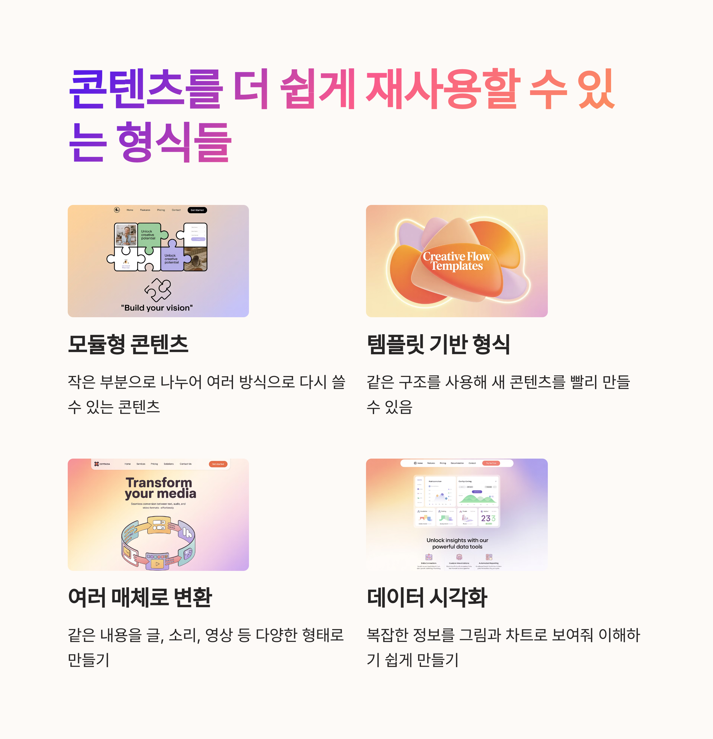 - 재가공: 글 → 카드뉴스, 영상, 인포그래픽으로 변환