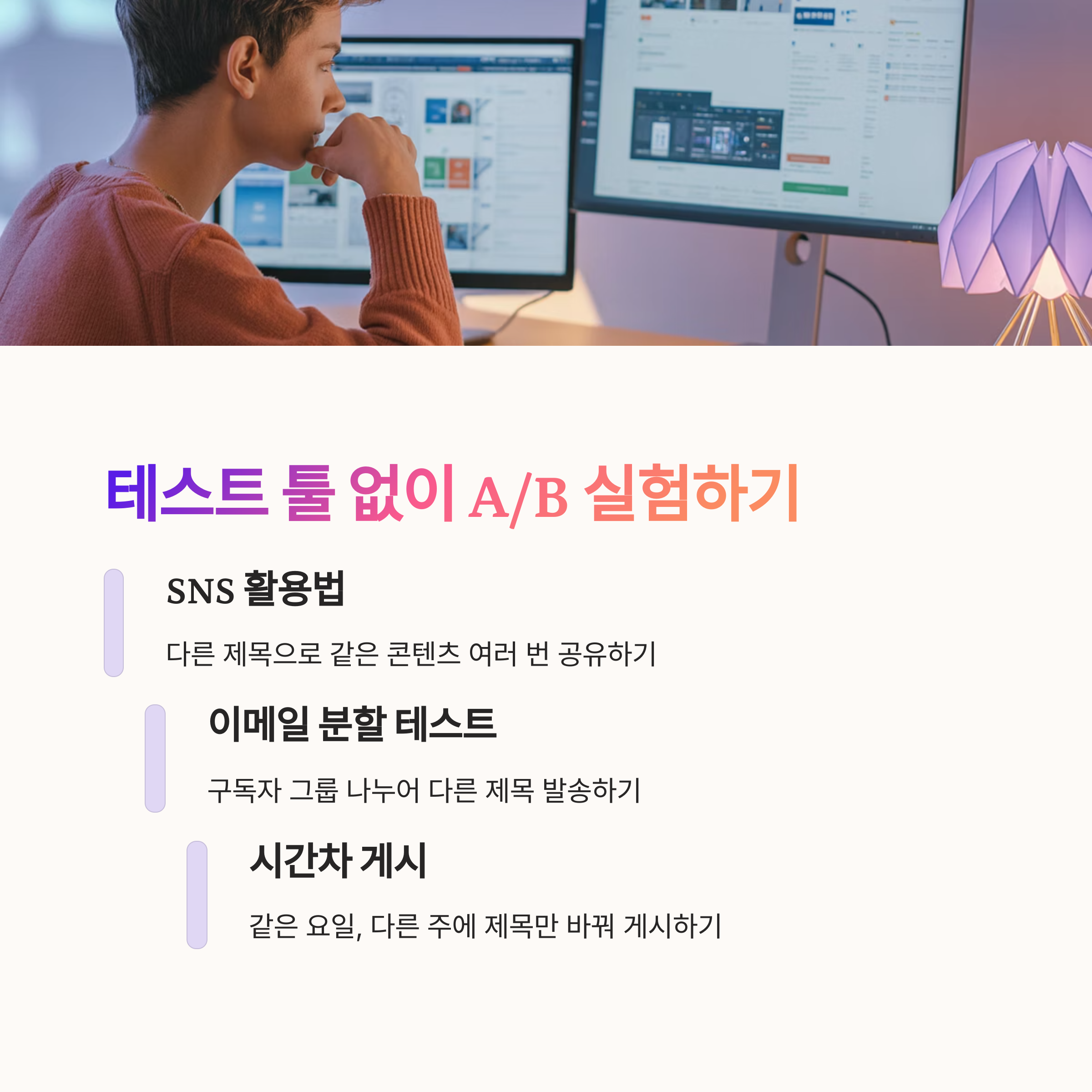매번 새로운 글에 적용하기보다, 퍼포먼스가 낮은 기존 글을 중심으로 주 1회 테스트해보는 걸 추천드려요.