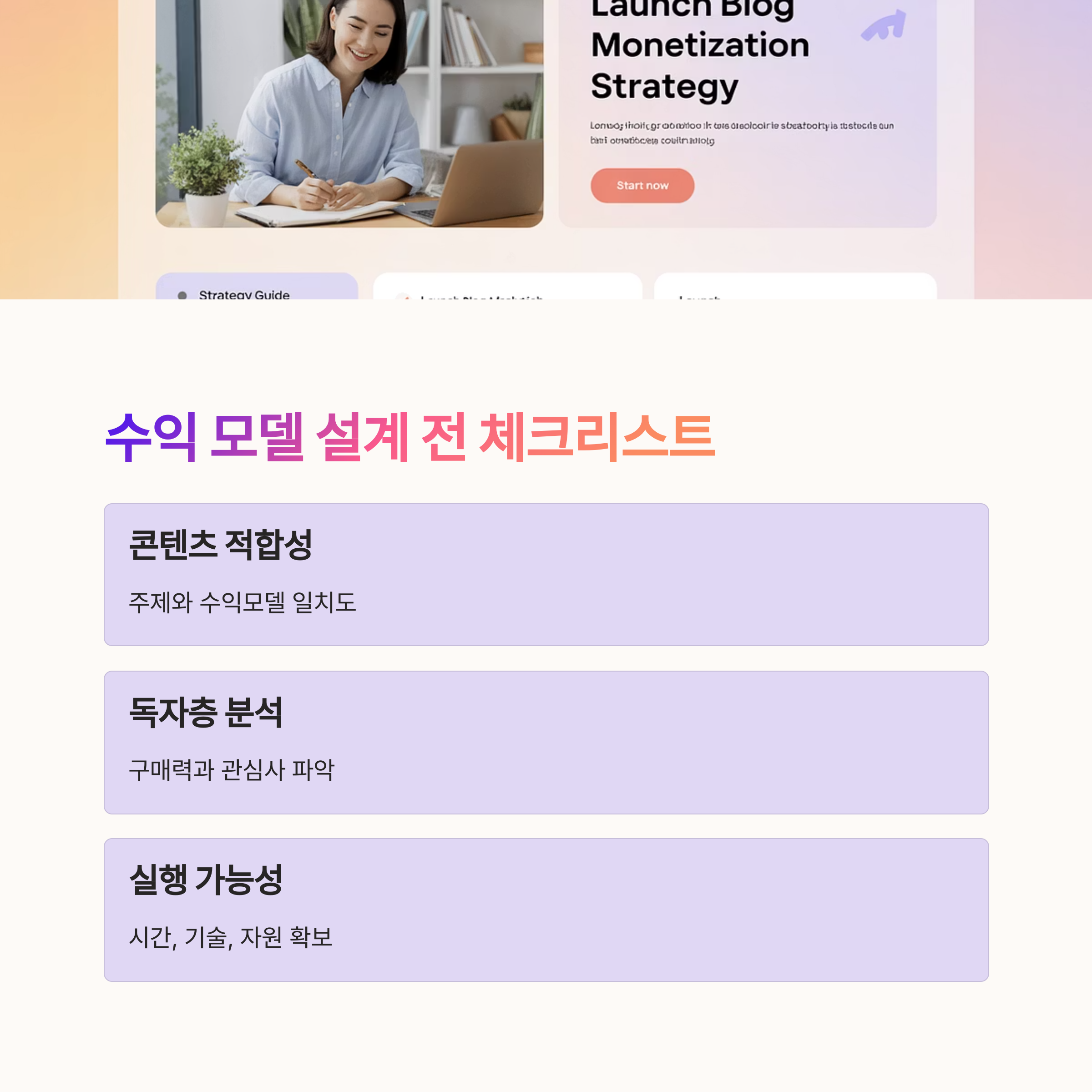 이 체크리스트를 바탕으로 현재 상태를 진단하면, 전략적으로 적합한 수익모델을 선택할 수 있습니다.