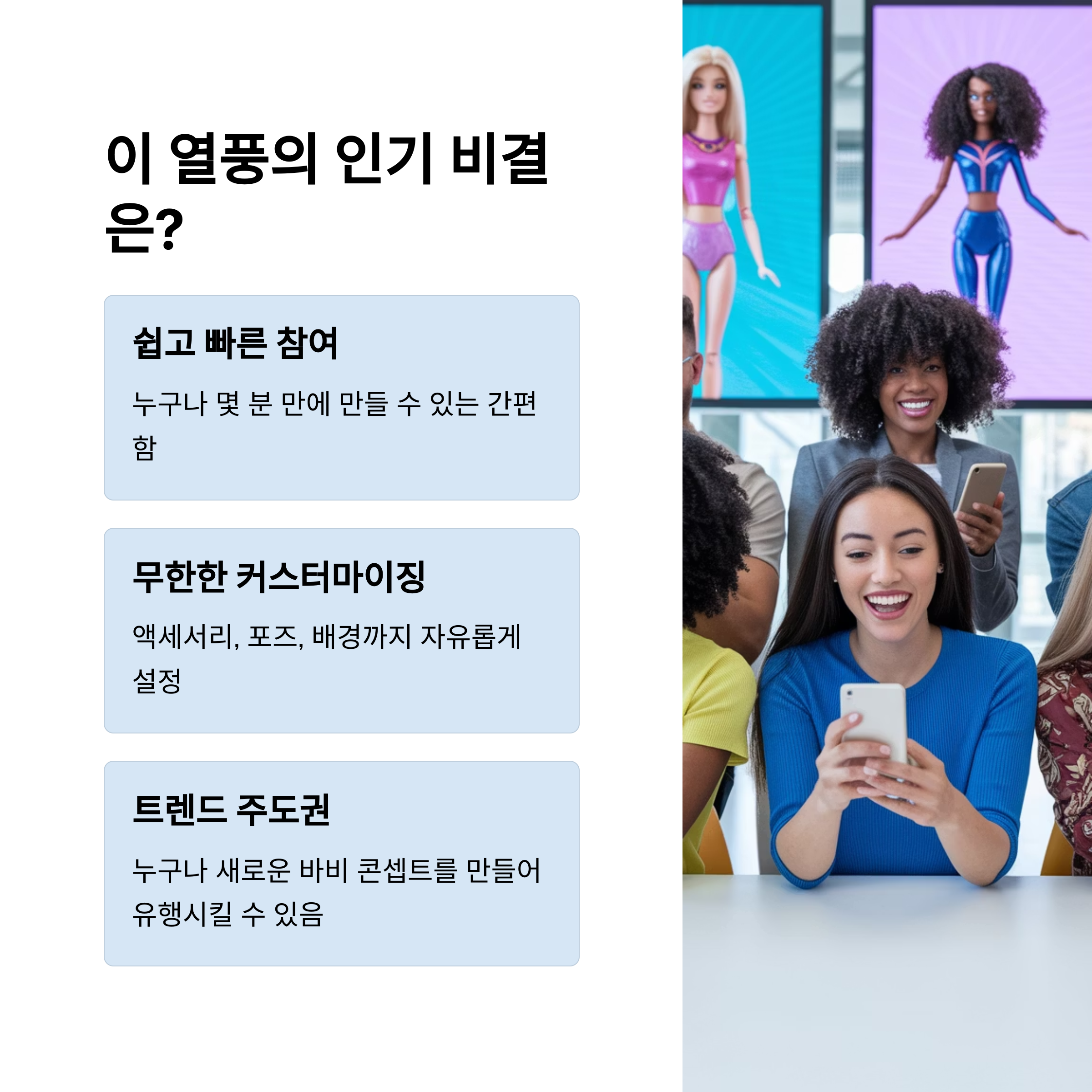 이 콘텐츠는 단순한 재미를 넘어서 콘텐츠 제작, 브랜딩, SNS 활용까지 다양한 영역에서 활용도가 높아지며 실용성과 재미를 동시에 제공하고 있습니다. 전 세계 수많은 사용자들이 자신만의 AI 바비 피규어를 만들며 웃음을 자아내고, 감탄을 자아내는 지금, 여러분도 한 번쯤 AI 바비 피규어에 도전해보는 건 어떨까요?