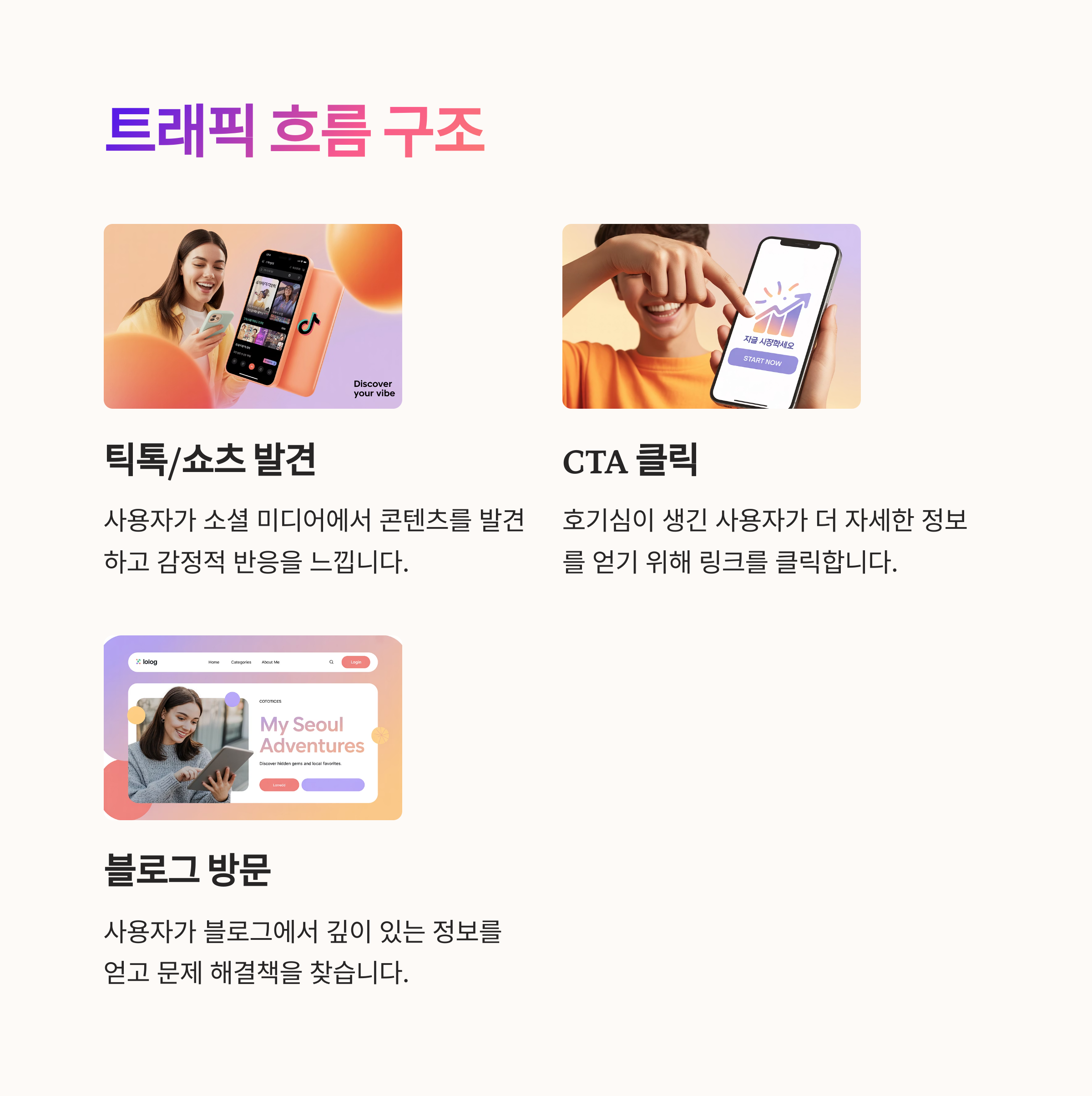 틱톡과 쇼츠의 본질은 ‘감정에서 출발한 정보 탐색의 회로’입니다. 이 트래픽 구조를 이해하고, 후킹-감정 유도-전환의 UX 흐름을 만들 수 있어야 단순 노출이 아닌, 클릭 기반의 성과로 연결됩니다.