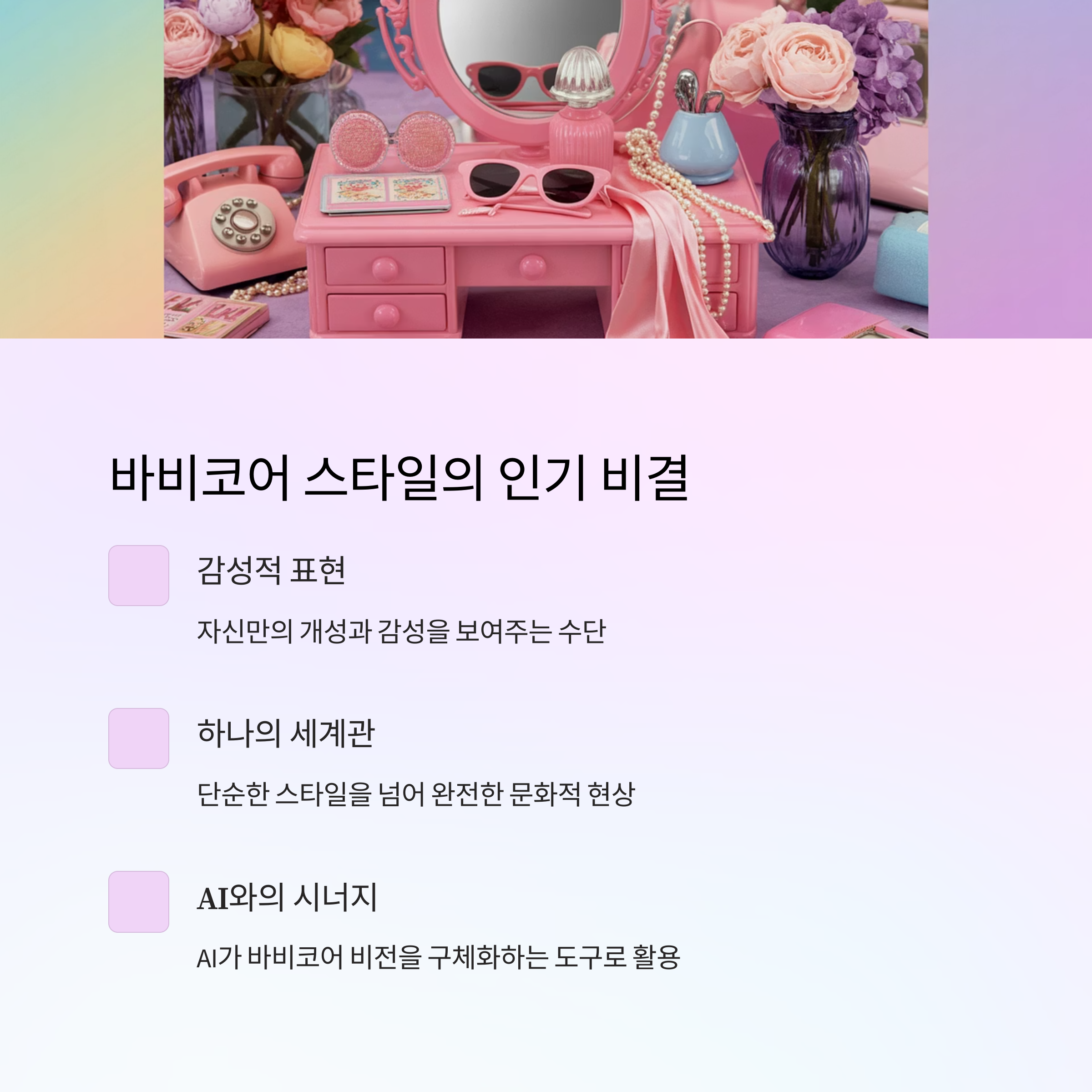 AI는 이제 단순한 생성 도구가 아니라, 콘셉트 디렉터이자 시각화 파트너입니다. 룩북 콘텐츠는 “내가 어떤 사람인지, 어떤 감성을 보여주고 싶은지”를 표현하는 가장 감각적인 수단입니다. 바비코어는 그 자체로 하나의 세계관이고, AI는 그걸 구체화하는 도구입니다.