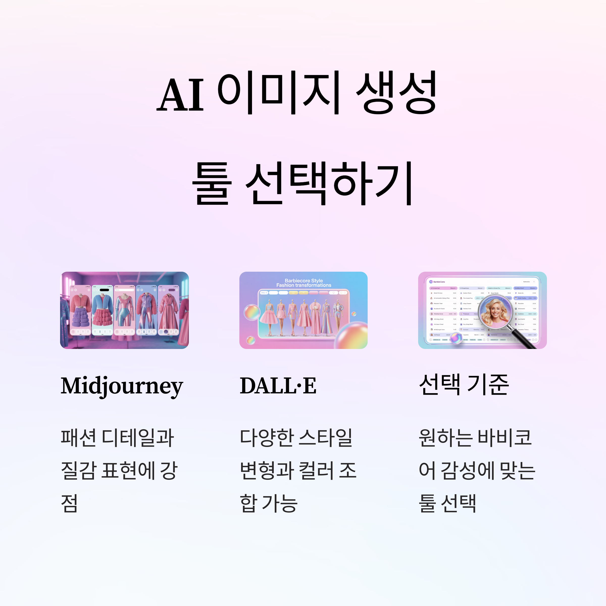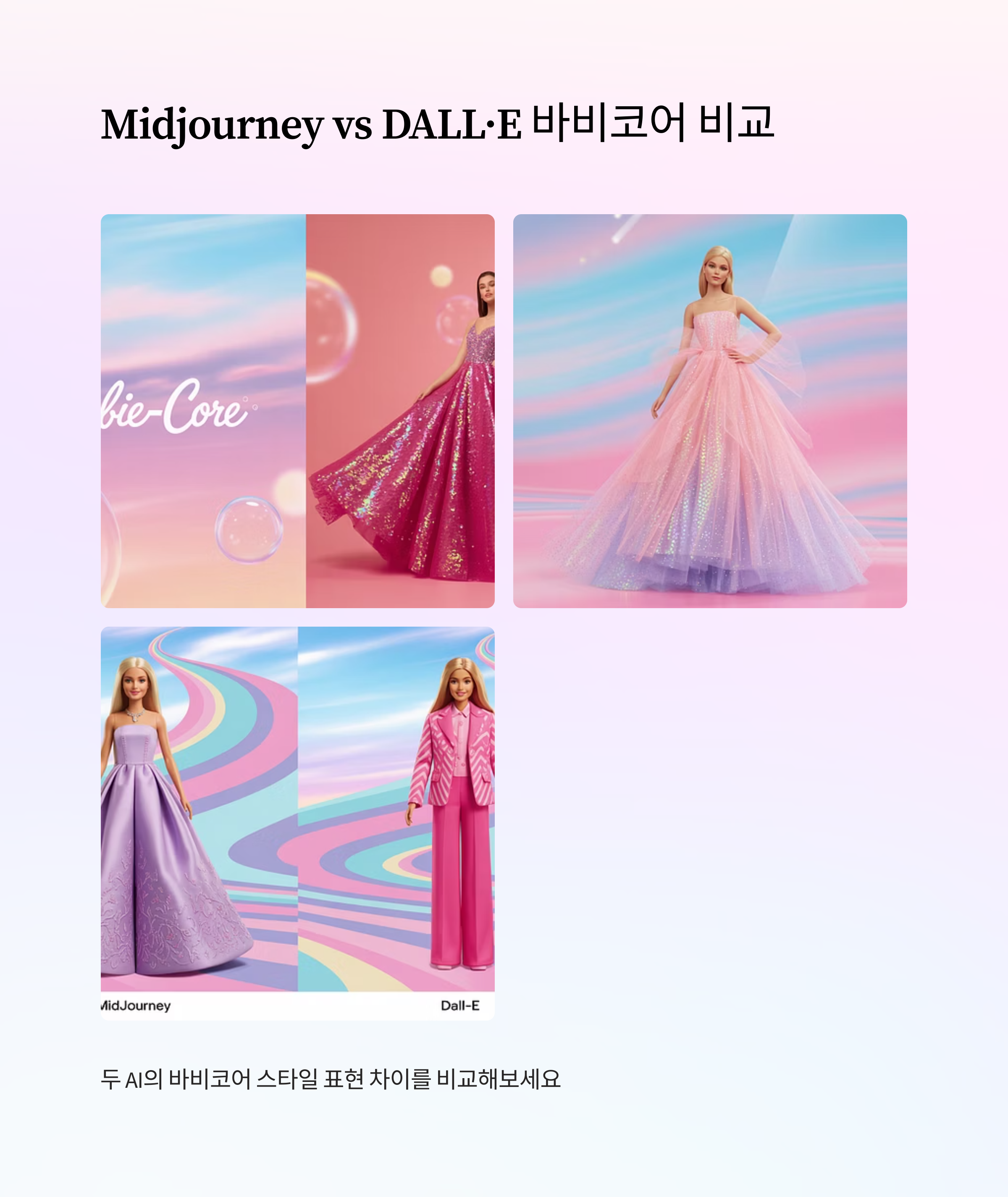 AI 룩북 콘텐츠는 생성 도구 선택에 따라 분위기, 색감, 스타일 완성도가 크게 달라집니다. 바비코어 스타일을 구현하는 데 있어 Midjourney와 DALL·E는 각기 다른 장점을 지니며, 활용 목적에 따라 맞춤 선택이 필요합니다.