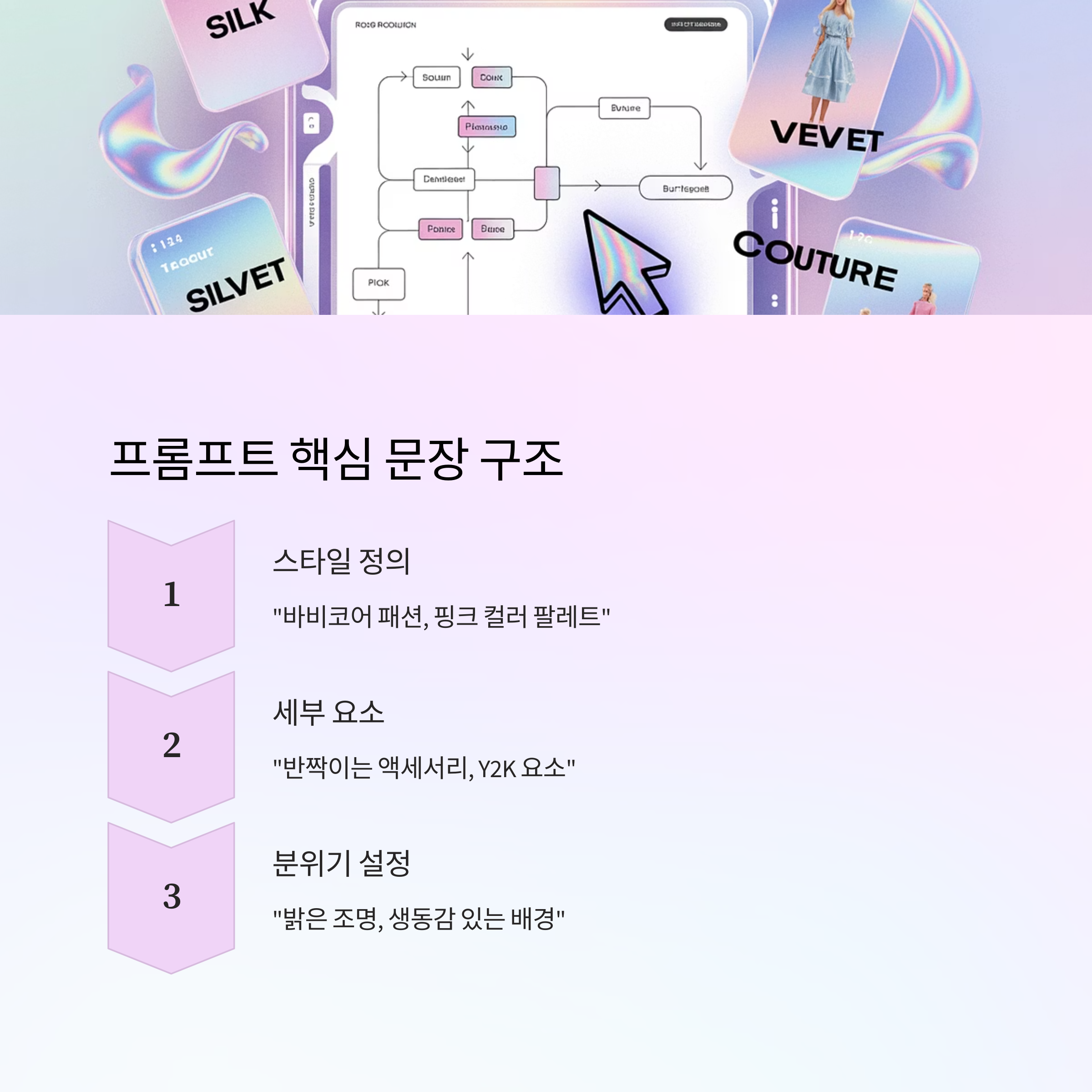 AI 이미지 생성에서 프롬프트란 곧 ‘가상 포토그래퍼에게 지시하는 촬영 콘티’입니다. 바비코어 룩북을 만들기 위한 프롬프트는 의상 스타일 + 헤어/메이크업 + 배경 + 구도 + 분위기의 5요소를 균형 있게 포함해야 합니다.