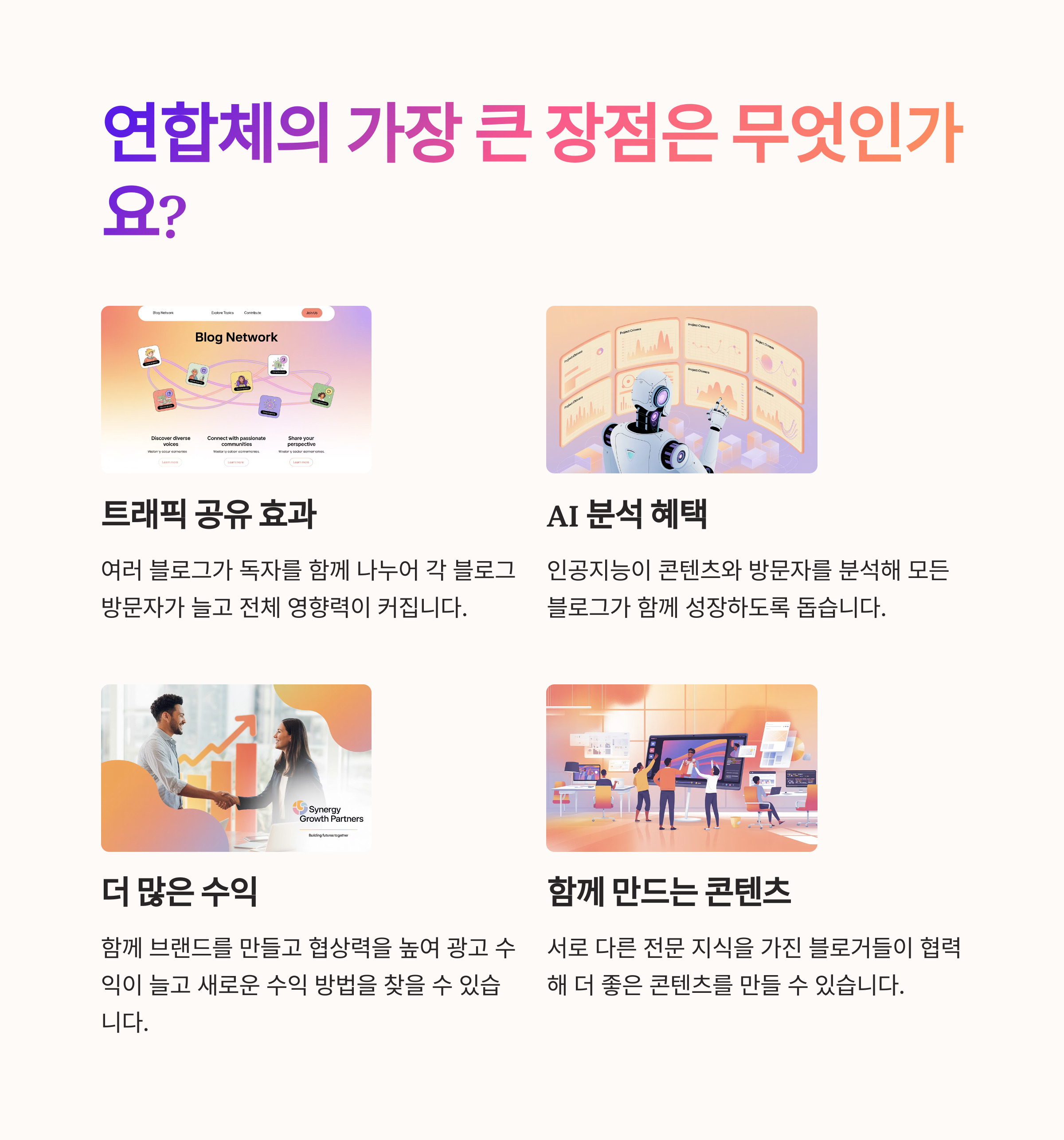 트래픽 교차 유입과 공동 브랜딩으로 단독 운영보다 훨씬 빠른 성장과 수익화를 경험할 수 있습니다.