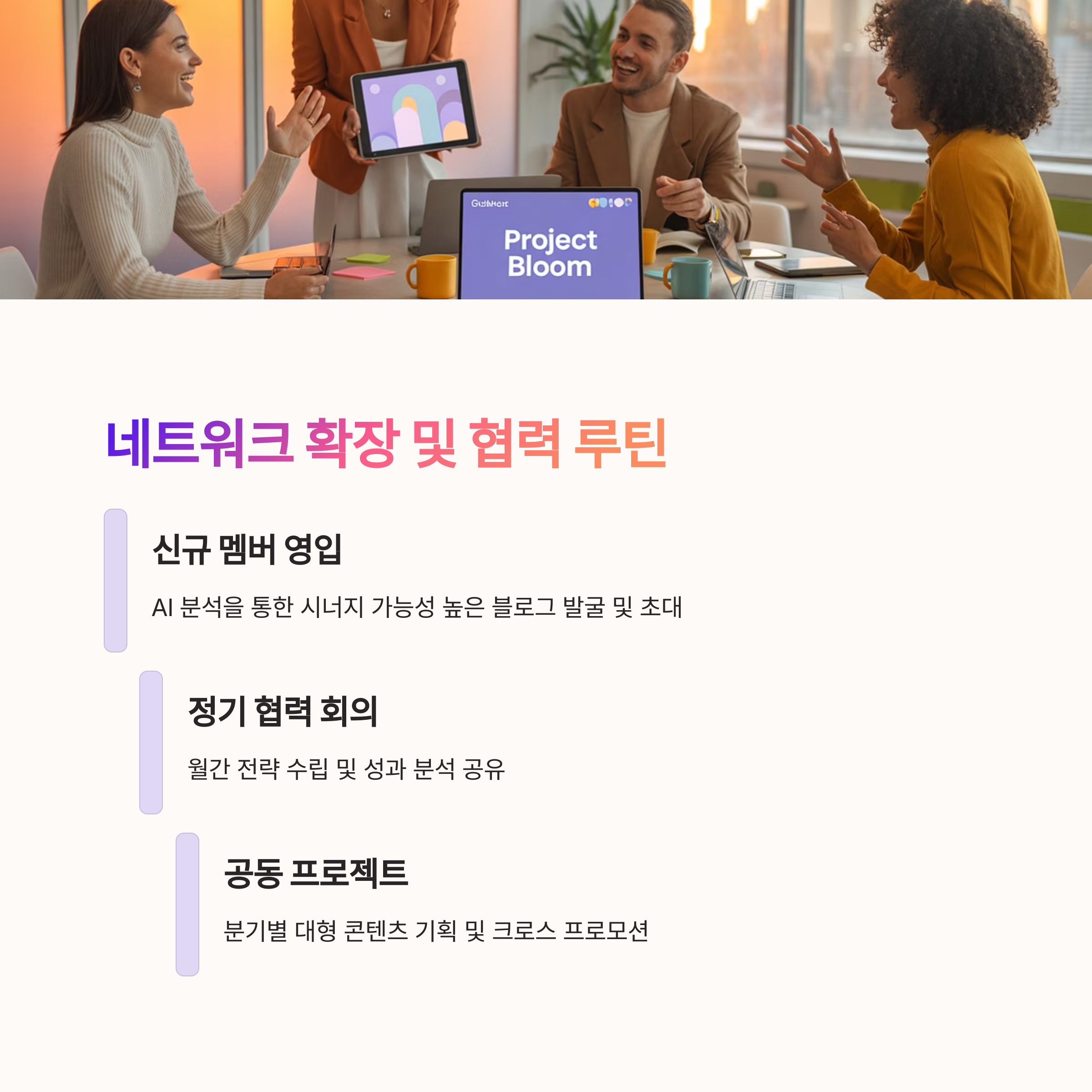 연합체는 외부 블로그, 크리에이터, 인플루언서들과의 연계를 통해 확장됩니다. 그리고 무엇보다 ‘협력 루틴’이 중요해요. 서로 언제 미팅하고, 어떤 기준으로 합류시키며, 성과를 어떻게 피드백할 것인지 정해두면 훨씬 안정적으로 운영할 수 있어요.