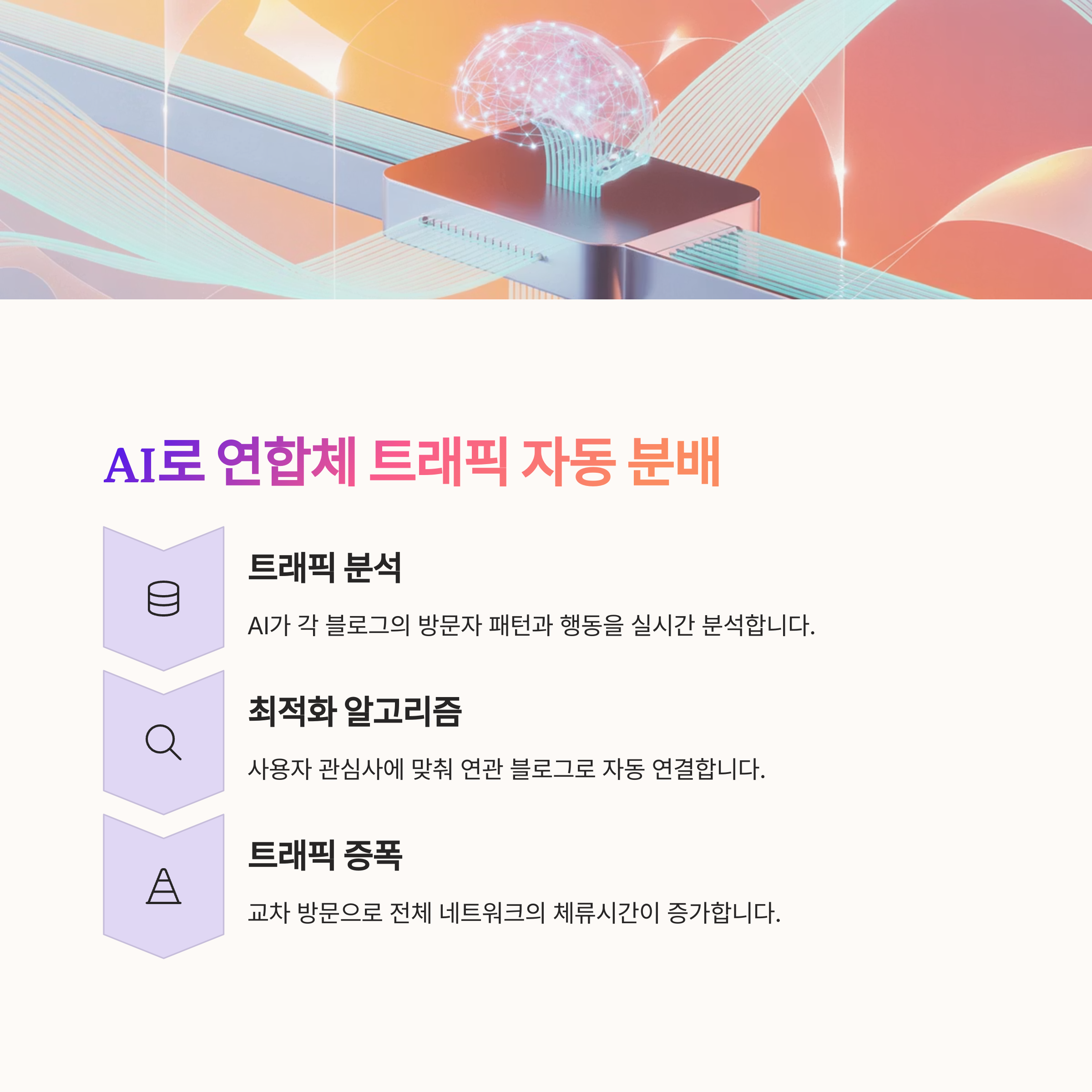 AI가 트래픽을 분배한다고 하면 조금 생소할 수도 있어요. 하지만 실제로는 '어떤 콘텐츠를 어떤 채널에, 언제 배포하느냐'를 자동으로 계산해주는 거죠. 특정 블로그에 집중된 유입을 다른 파트너 블로그로 자연스럽게 유도하거나, AI가 유사 콘텐츠 간 내부 링크를 자동 생성해주는 구조입니다.
