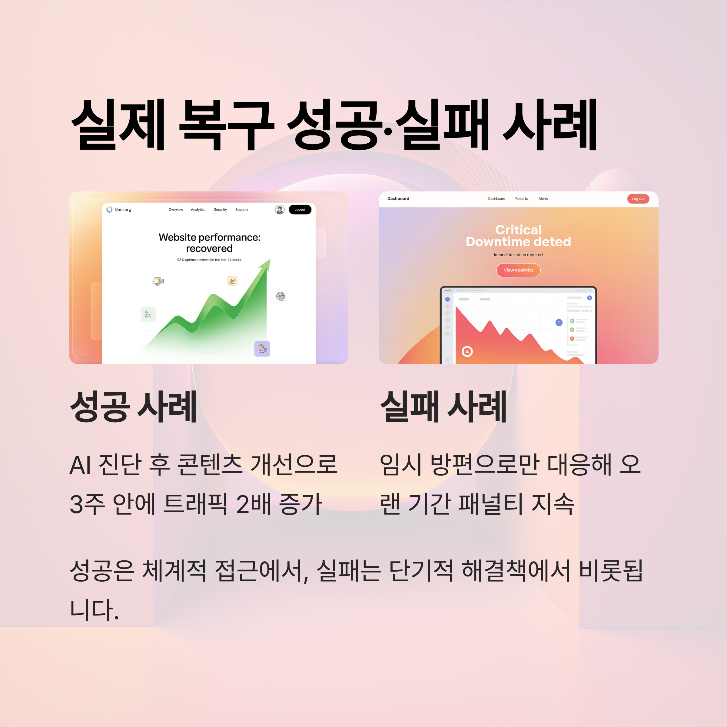 2023년 봄, 한 블로그 콘텐츠가 ‘AI 생성 콘텐츠 과잉’으로 패널티를 받았는데, 저품질 진단 후 구조 리뉴얼·출처 추가·작성자 명시를 통해 2개월 만에 완전 복구에 성공했어요. 반면, 중복 콘텐츠를 삭제 없이 방치했던 사례는 여전히 색인 제외 상태예요. 이처럼 AI 진단과 리뉴얼 실행력의 차이가 성패를 가르죠.