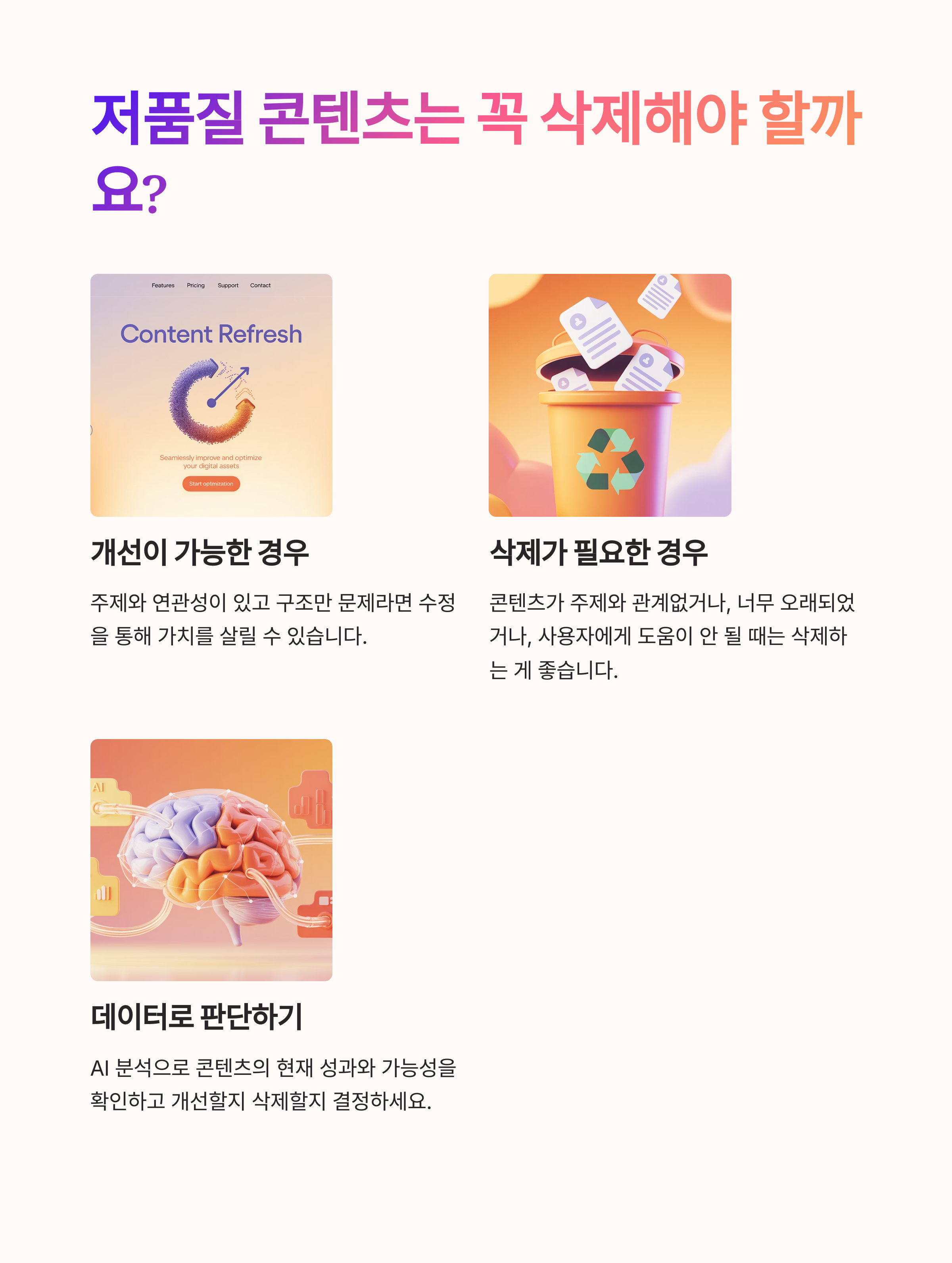 아니요. 삭제보다 리뉴얼이 더 효과적이며, 정보 구조 정비와 E-E-A-T 강화로 회복이 가능합니다.